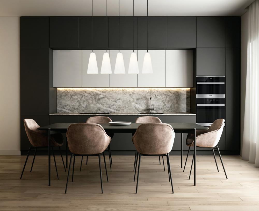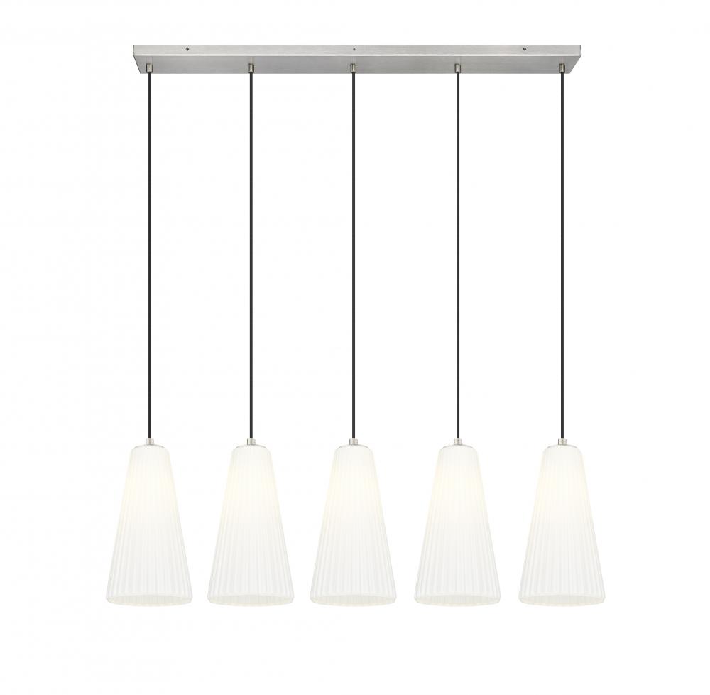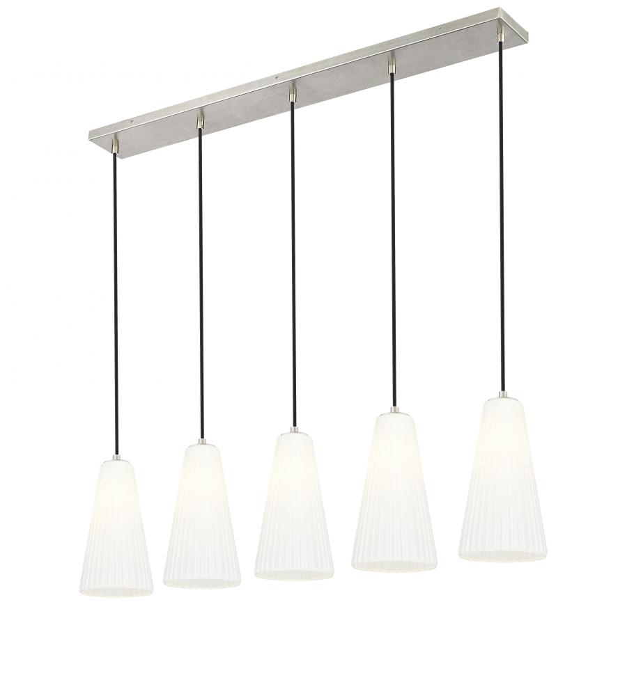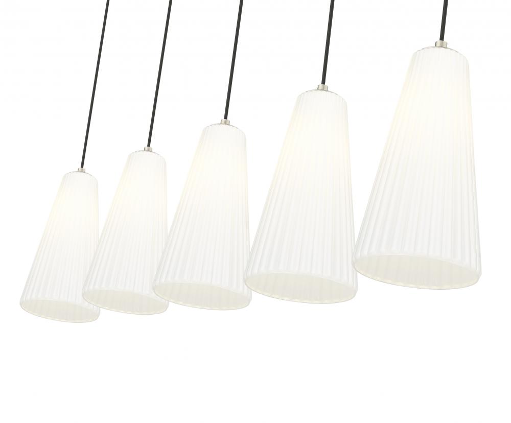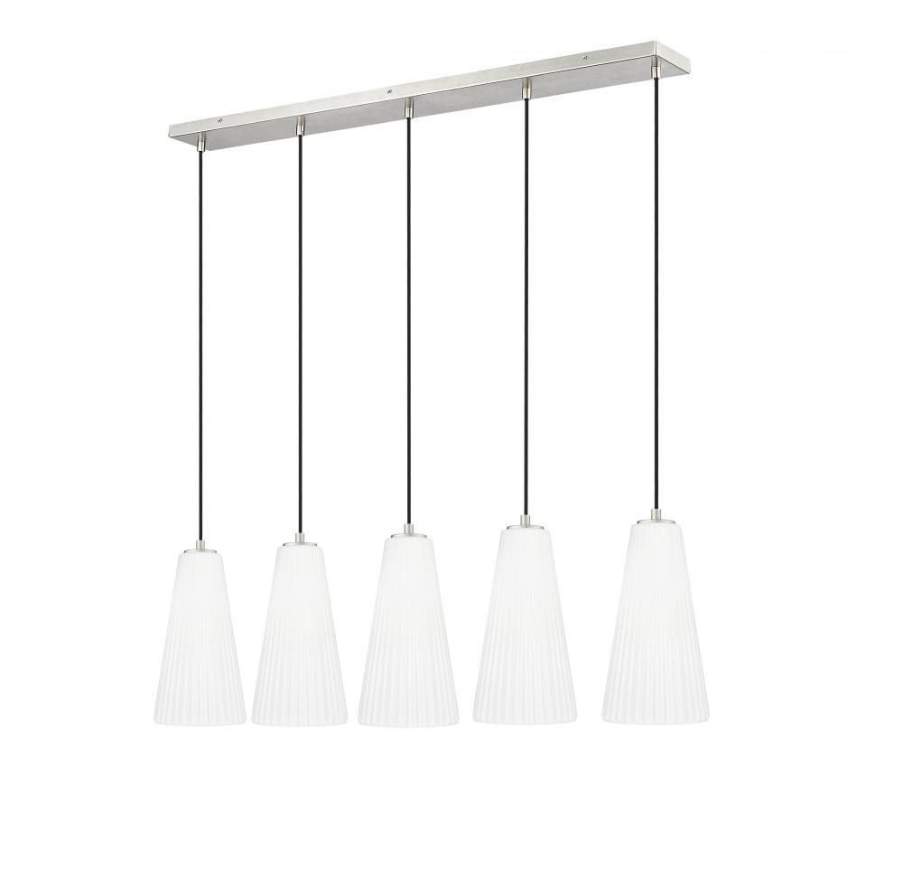 Gentle flare and fluting create a supremely sophisticated silhouette for this modern five-light island chandelier. The linear design is sleek and refined, featuring a brushed nickel finish and slim cords that suspend each light at an equal height, lending a sense of symmetry over a kitchen island or dining table.