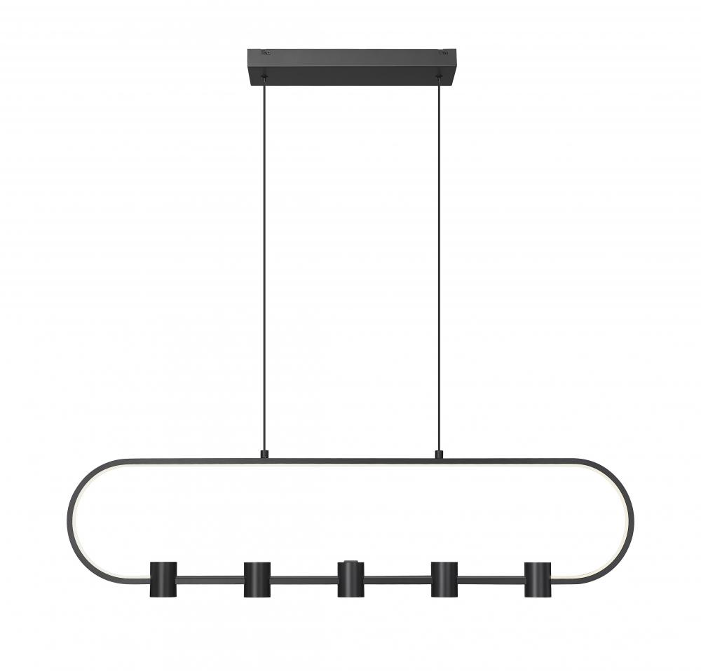 Islands and other horizontal spaces welcome the reach and silhouette of this five-light LED linear chandelier, a playful fixture style with refining shape. An oval matte black aluminum open metalwork body with multiple cylinder shades twist the conventional style of a fixture, giving it a home in casual spaces. LED lighting is dimmable, creating custom levels of illumination to suit desires through the day and night.