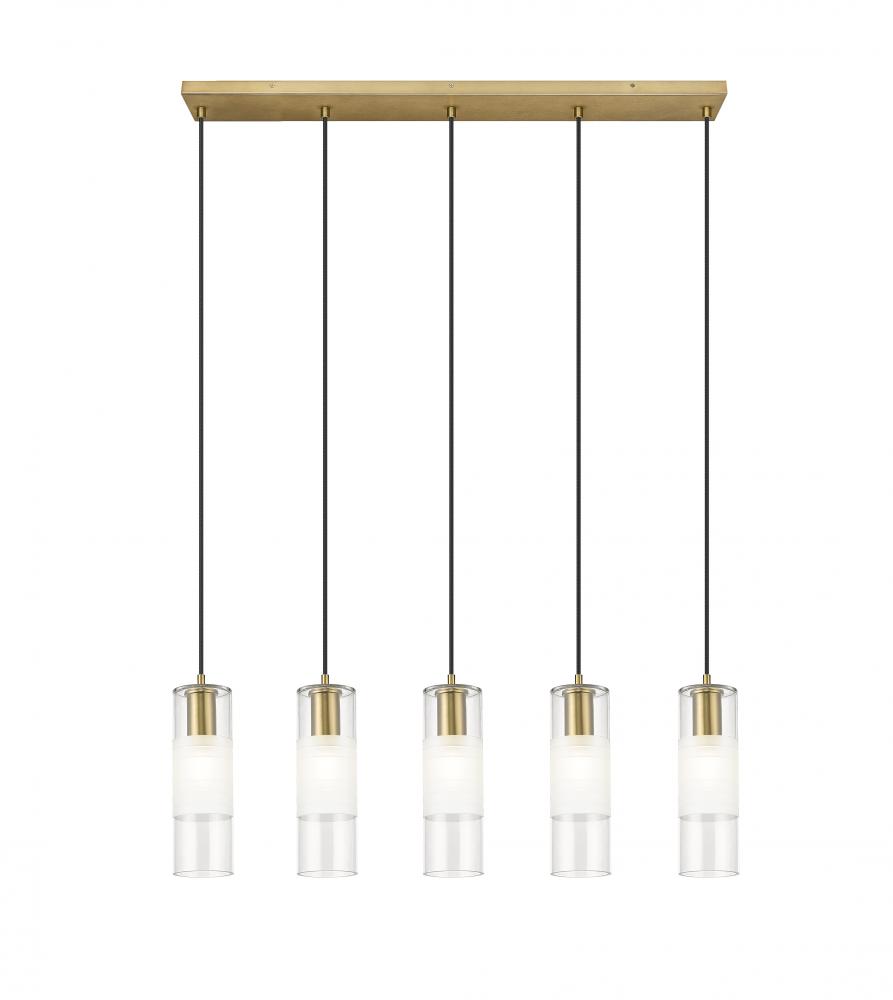 Tailored simplicity infuses a modern five-light linear chandelier with sophistication. Its warm modern gold finish frame and robust housings gleam in the light, offering wonderful contrast to braided cloth covered cords that suspend each light in this island fixture, making it the perfect choice for refined but welcoming aesthetics in your kitchen or dining room.