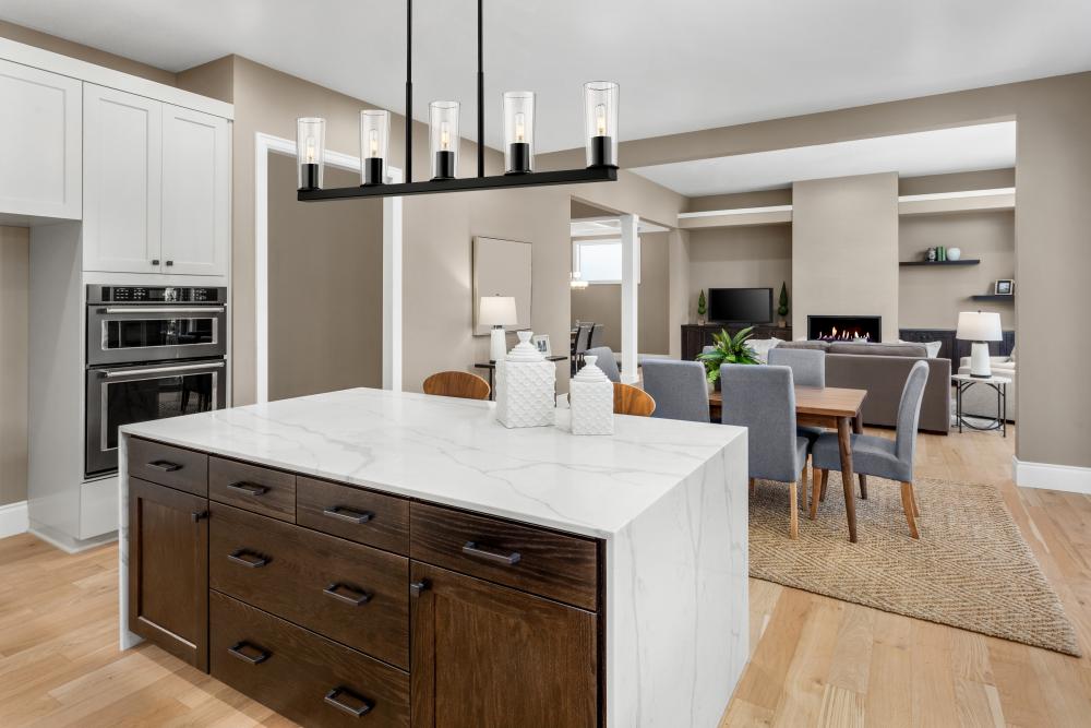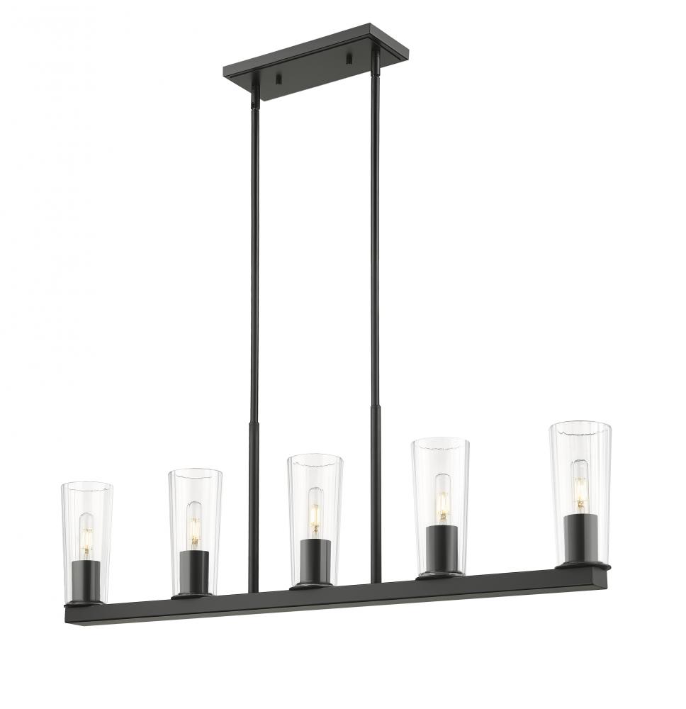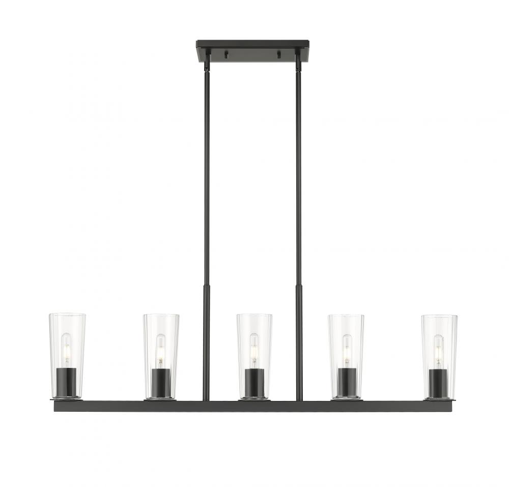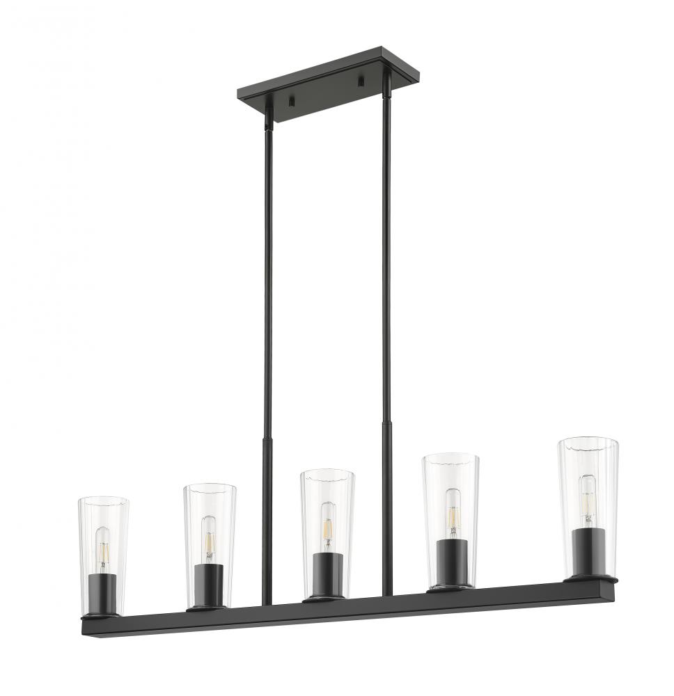 Bring stellar style to your kitchen island or dining table with the linear silhouette of a five-light chandelier. Delivering bright, bold uplighting, its a clean-lined structure that pairs a matte black finish with clear glass shades that taper to create a refined silhouette.