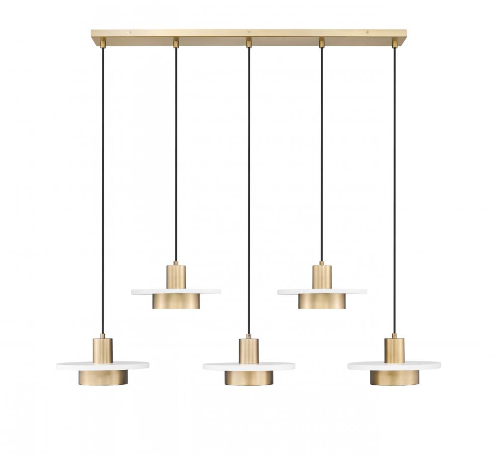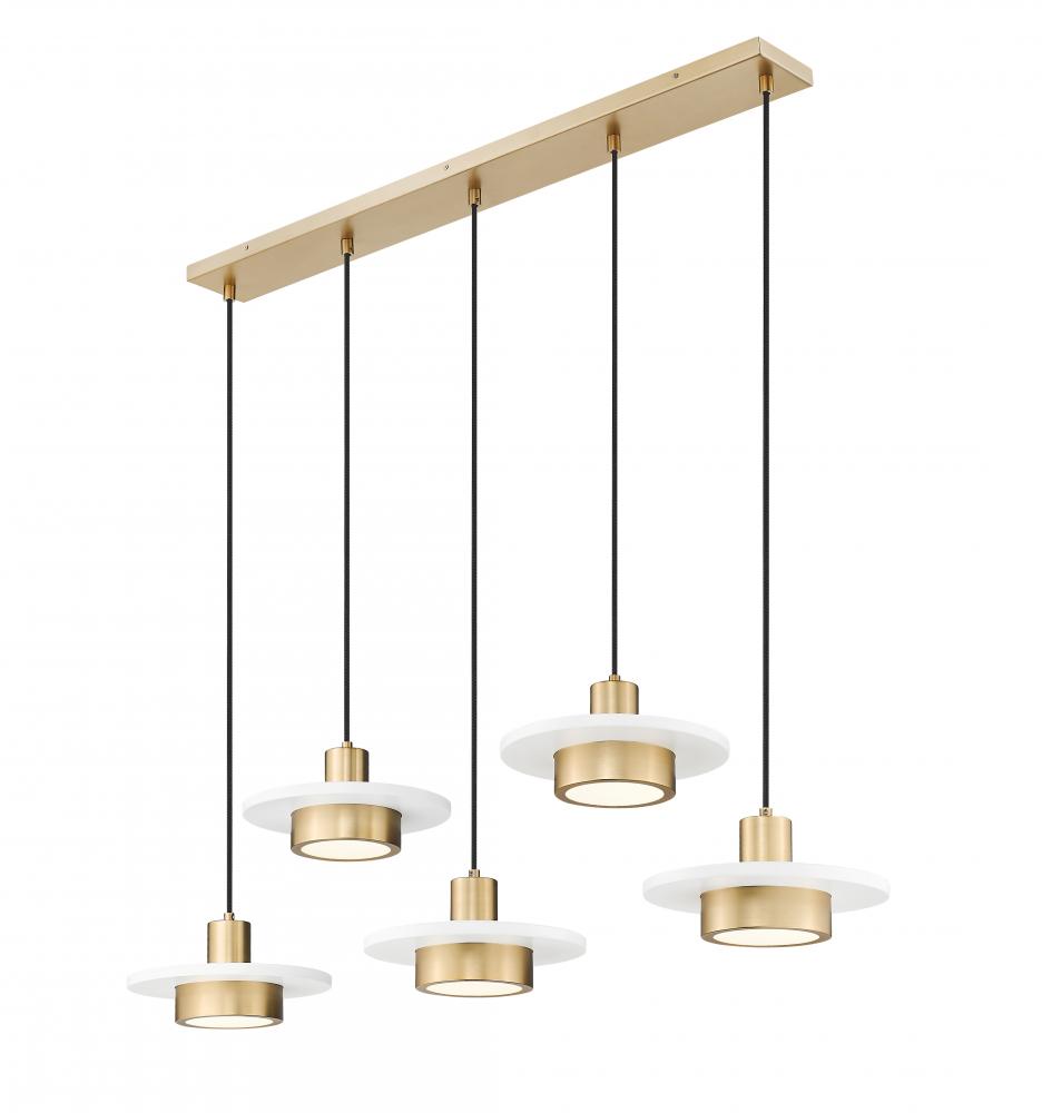Embrace the optically pleasing design of a five-light linear chandelier with a versatile motif and a warm modern gold finish over steel construction. Two-part luminaires interrupted by flat discs infuse LED lighting through frosted acrylic diffusers, giving the option of mood-changing with dimming features.