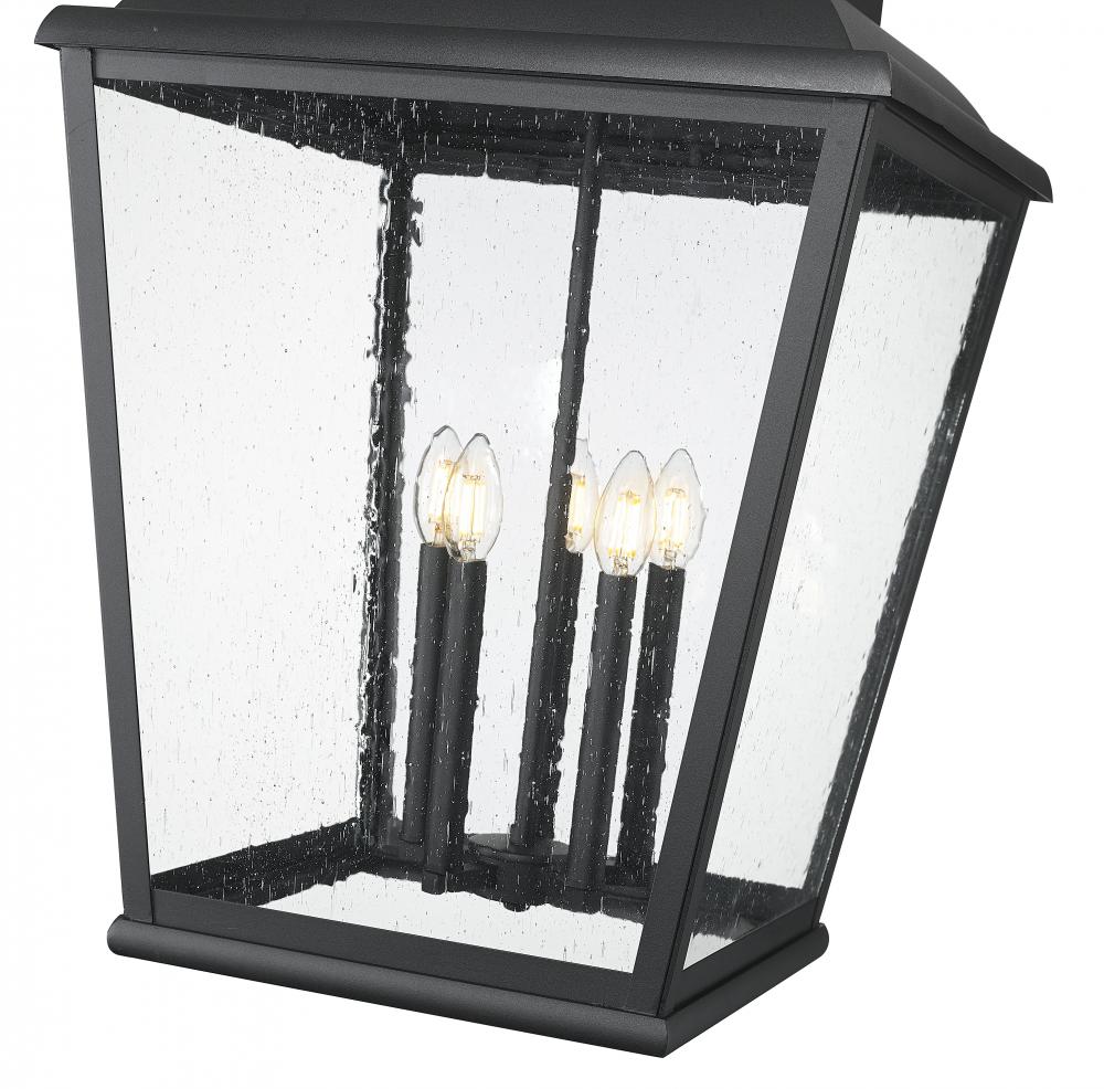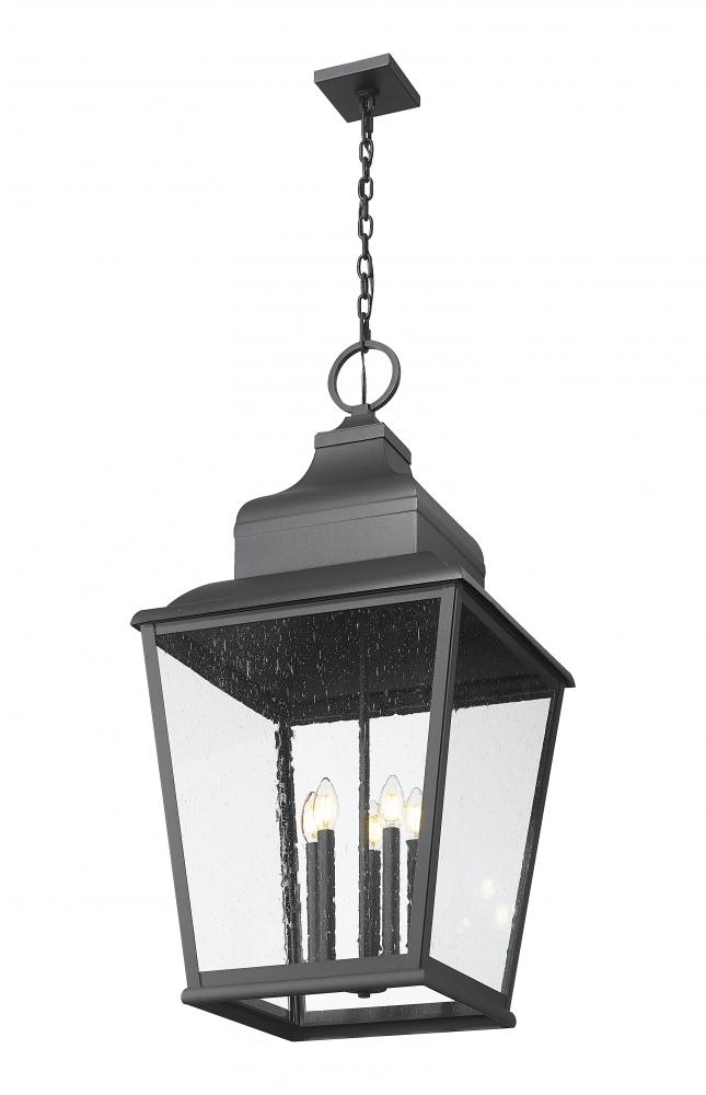 Timeless style offers decadent detail in a lantern-inspired five-light outdoor chain mounted ceiling light fixture, an excellent choice to preserve a sophisticated look with nostalgic sophistication A tapered aluminum frame featuring a sand black finish appears with a bold attitude, as clear seedy glass shade panels offer a full view of romantic interior candelabra-style bulb mounts. Enjoy customizable lighting levels with dimming features conforming to time-of-day conditions.