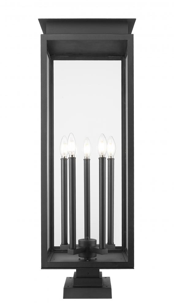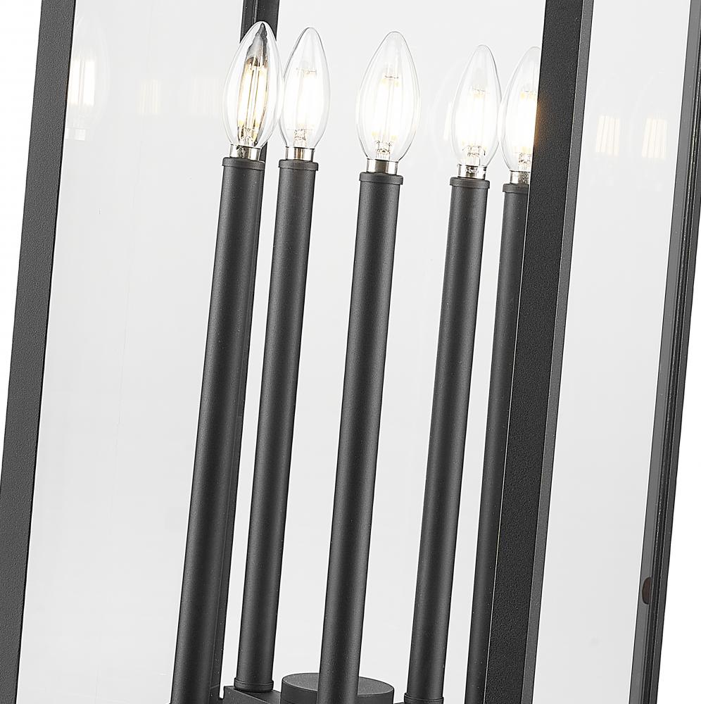 A tiered cap and clean, graceful lines define this transitional five-light outdoor pier mount light. Its classic elegance and lantern-inspired silhouette bring compelling flair to your exterior, while a coastal black finish delivers wonderful durability. The fixture includes glass panes and tall candelabra lights, perfect for a cozy and inviting ambiance.