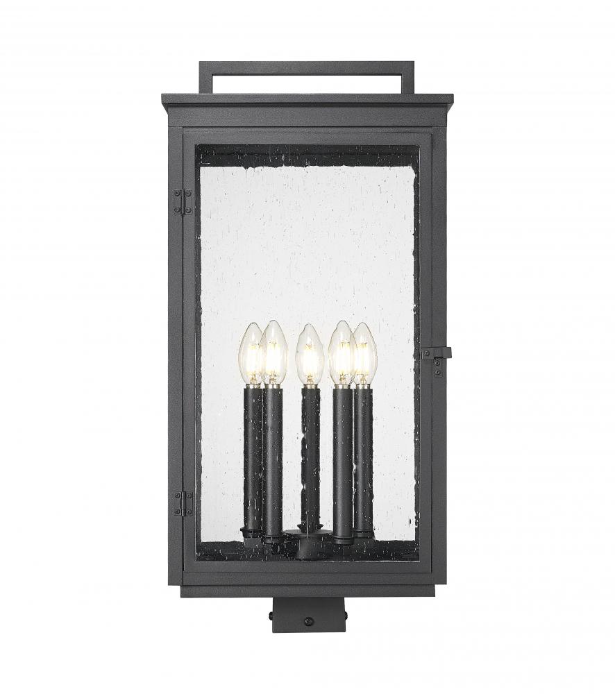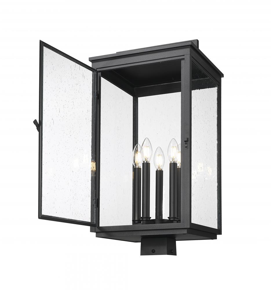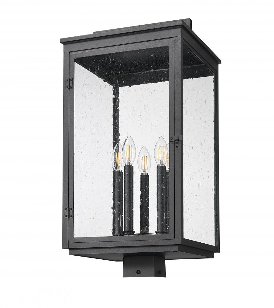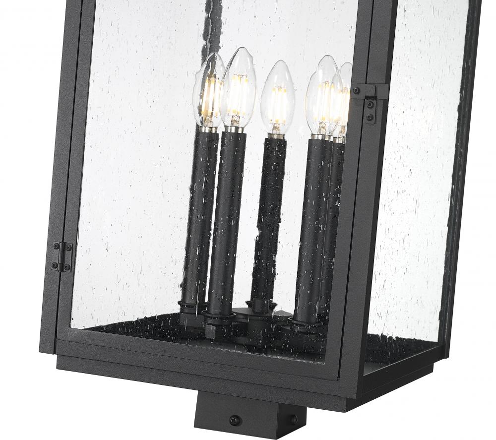 Dressed to impress in an elegant sand black finish, this tall post mount fixture brings vintage-inspired ambiance to driveways or garden paths. Five glowing candle-style lights flicker softly through clear seedy glass, creating a warm, welcoming effect. The classic silhouette feels both grounded and graceful.