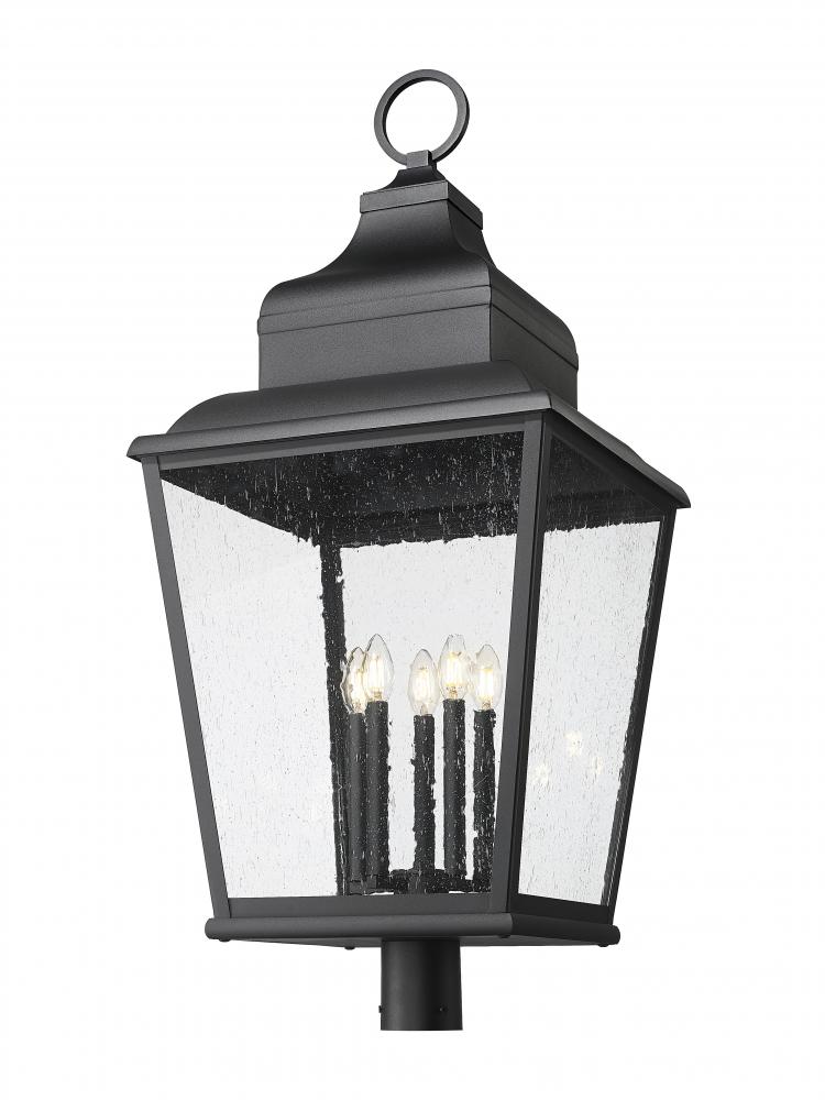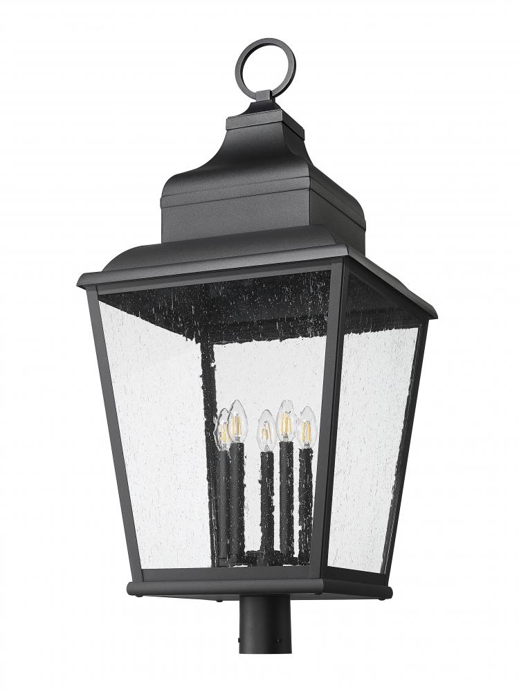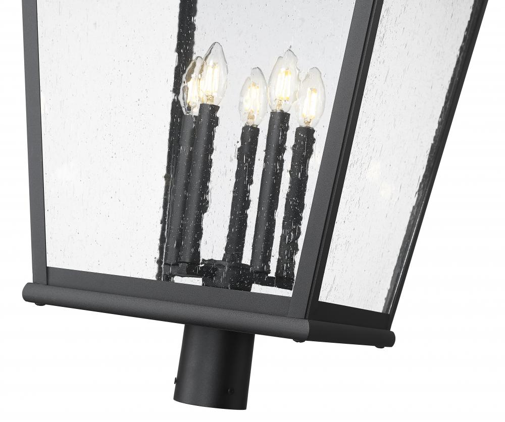 A twist on iconic lantern-inspired design, this five-light outdoor post mount fixture enhances residential or commercial exterior settings with a village motif. Sand black finish aluminum crafts a tapered frame with a tall, detail-rich roof, as clear seedy glass panels inspire with a bit of romance. Candelabra-style holders reflect a romantic ambience in a dimmable light perfect for round-the-clock illumination.