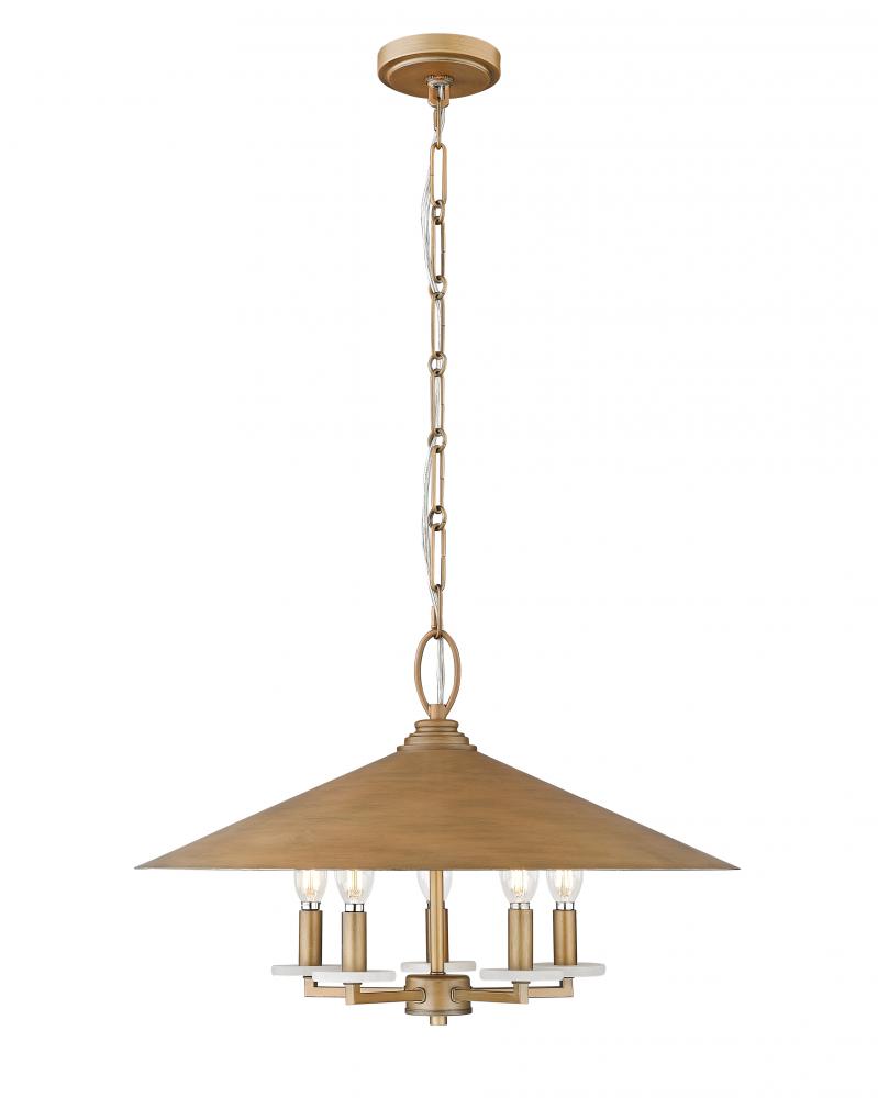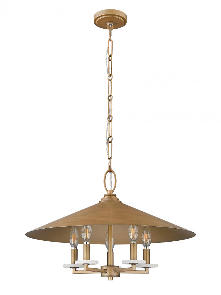 The warmth of a signature gold brings incredible style and cozy ambiance to this industrial five-light pendant. Its conical steel shade pairs with alabaster bobeches and three finishes of candle sleeves, creating a custom look over a dining table or in your entryway.