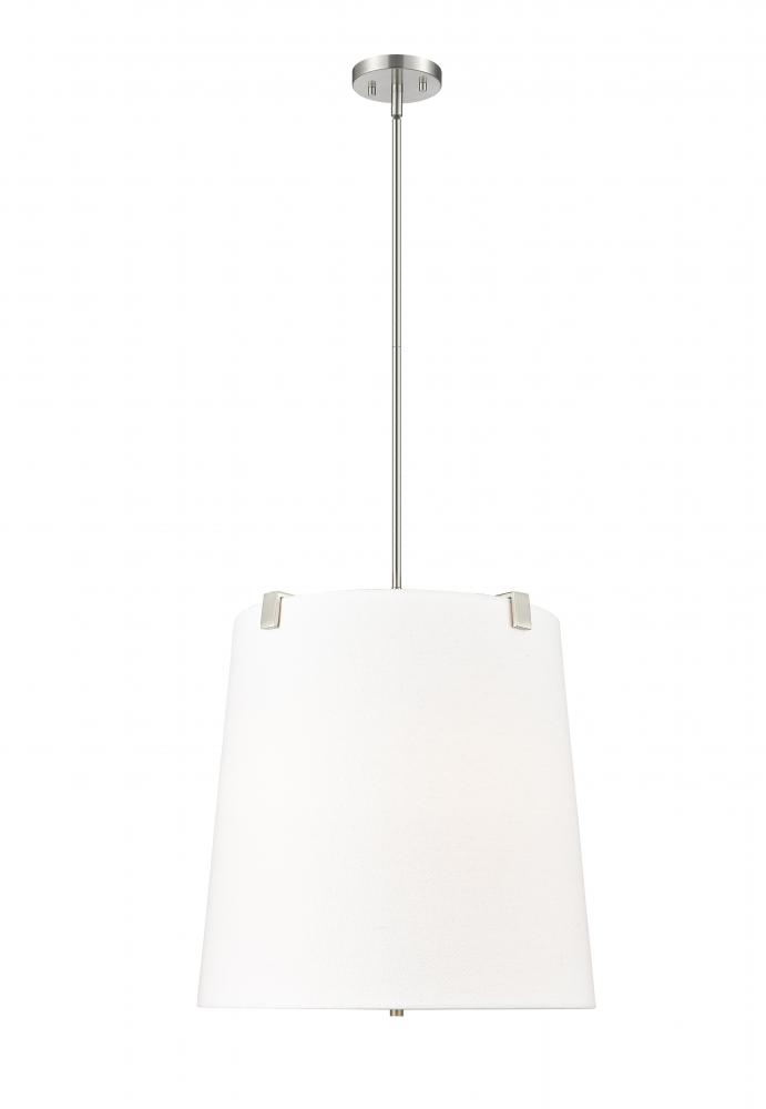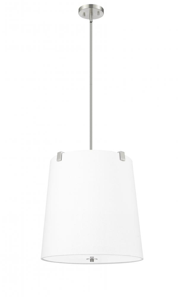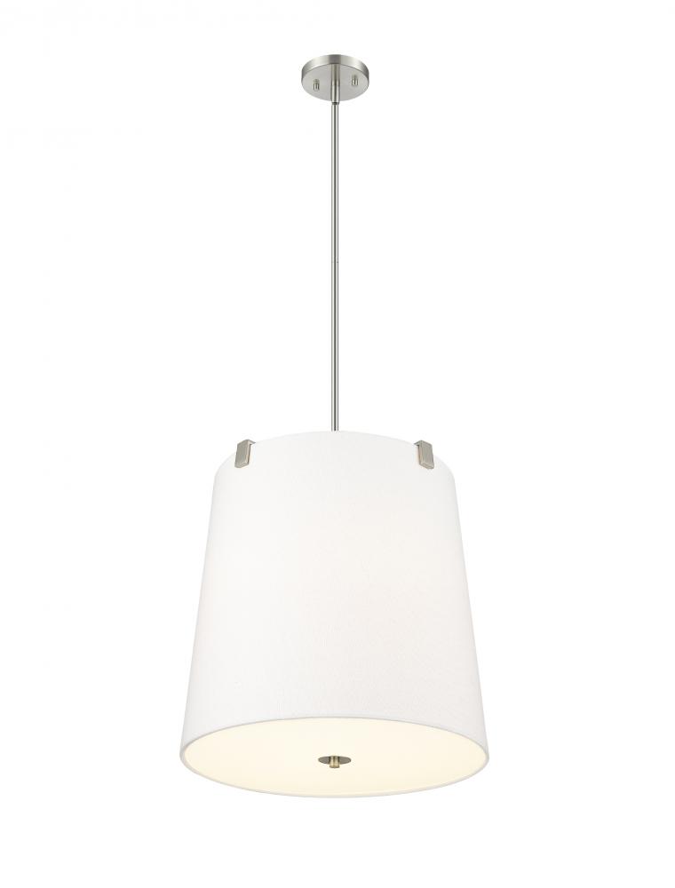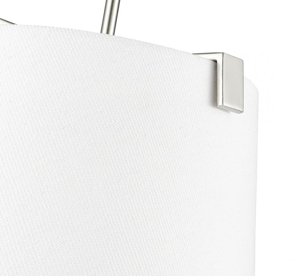 A simple minimalist aesthetic offers sophisticated and traditional style with this five-light pendant. Brushed nickel finish steel framing with clips attaches to a white linen fabric shade, offering a low-profile vibe, as candelabra lights diffuse illumination beautifully. This fixture is dimmable, creating mood lighting and efficient functionality.