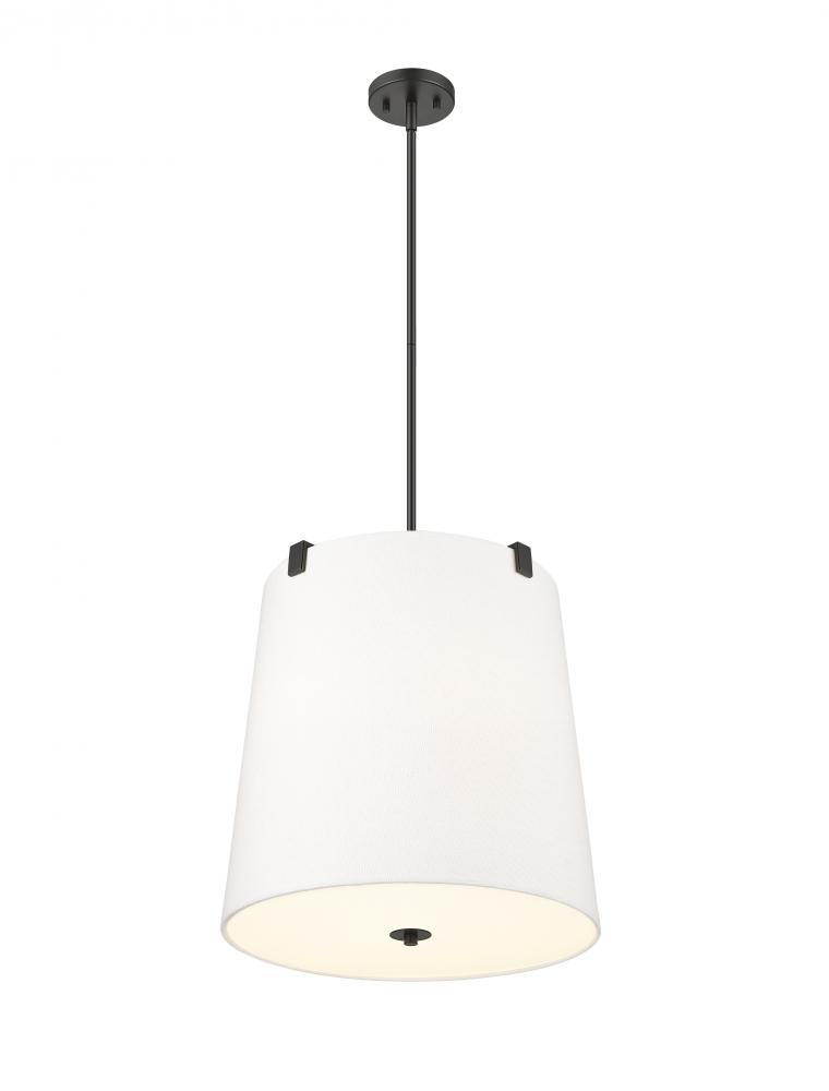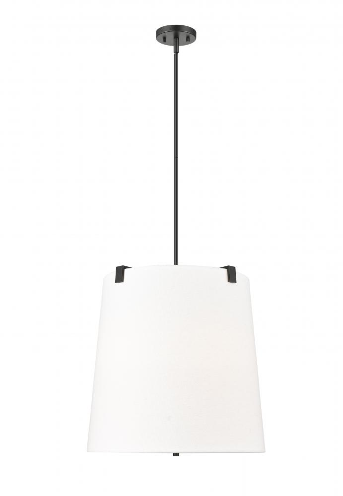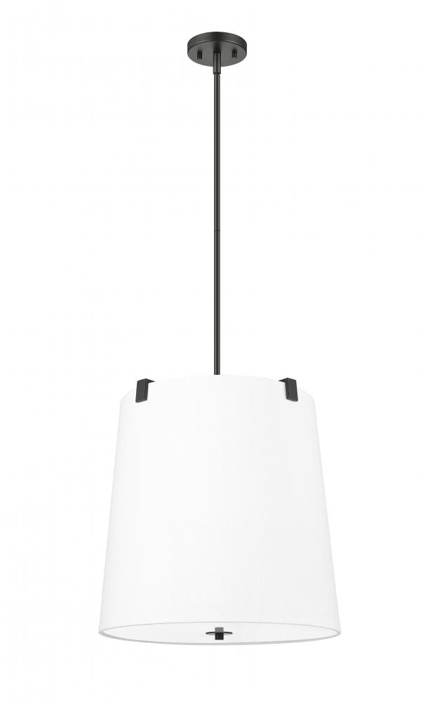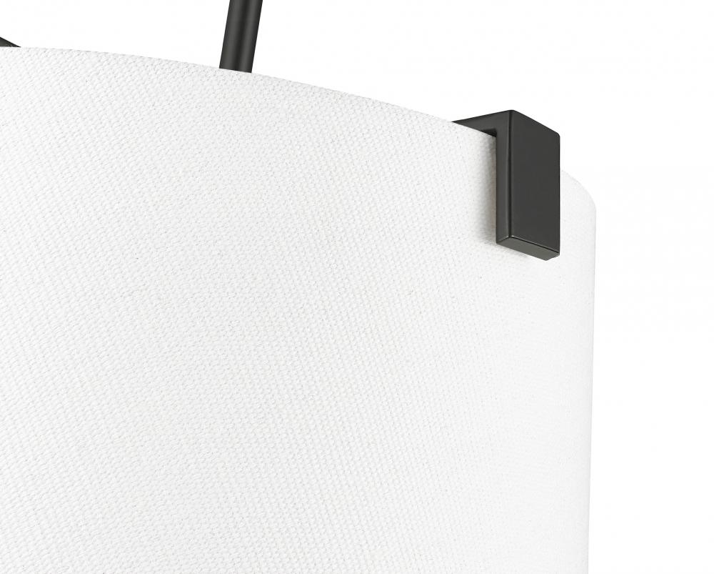 A simple minimalist aesthetic offers sophisticated and traditional style with this five-light pendant. Bold matte black finish steel framing with clips attaches to a white linen fabric shade, offering a low-profile vibe, as candelabra lights diffuse illumination beautifully. This fixture is dimmable, creating mood lighting and efficient functionality.