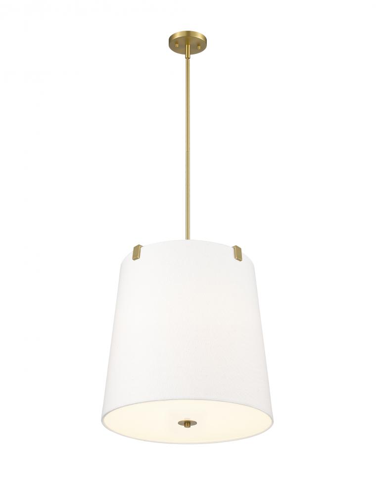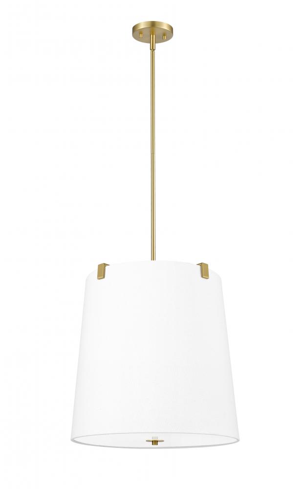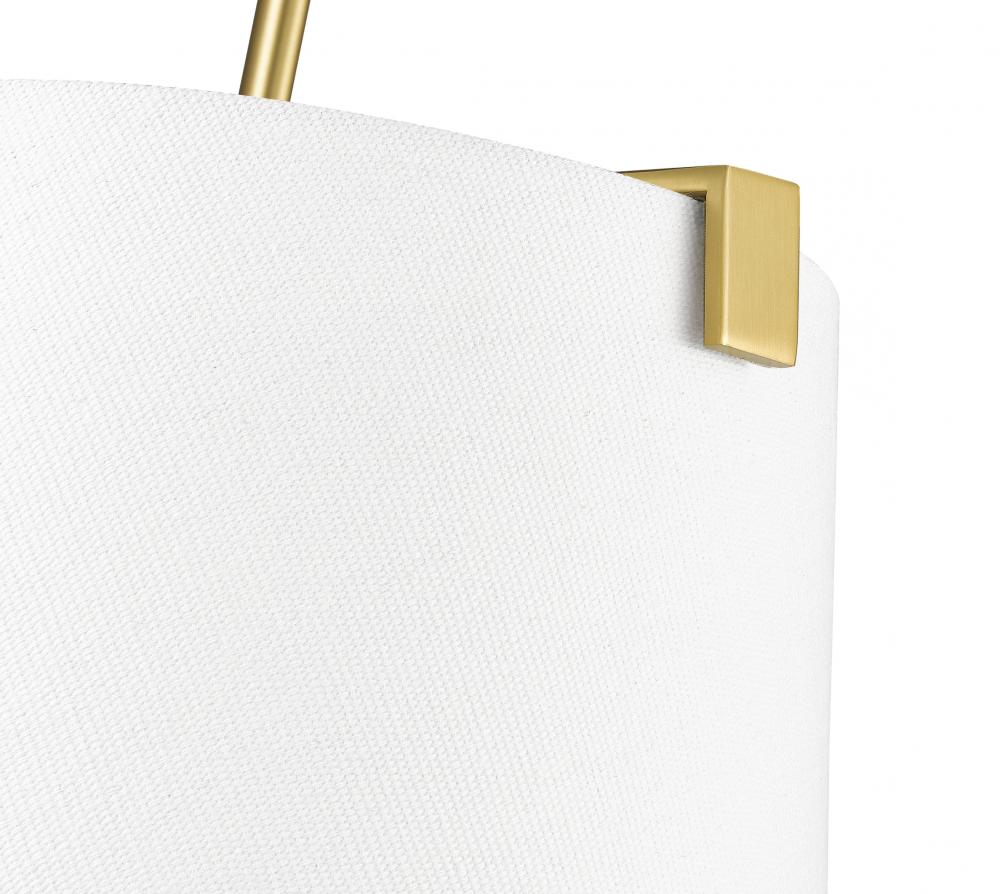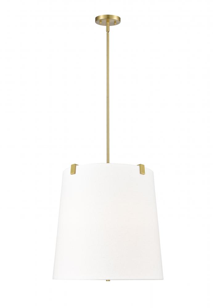 A simple minimalist aesthetic offers sophisticated and traditional style with this five-light pendant. Cool modern gold finish steel framing with clips attaches to a white linen fabric shade, offering a low-profile vibe, as candelabra lights diffuse illumination beautifully. This fixture is dimmable, creating mood lighting and efficient functionality.