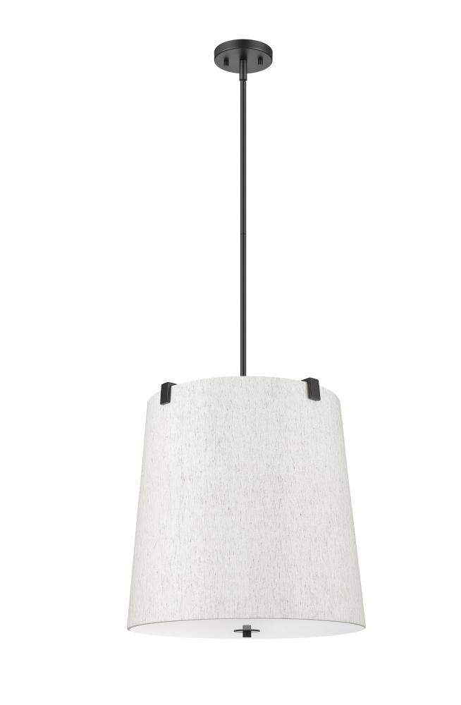 A tasteful motif mix delivers both traditional and modern aesthetics in a light fixture with functionality. This five-light pendant highlights islands or living spaces with a low-profile look, blending bold matte black finish steel framing and accent clips to a cream fabric shade, as candelabra lights filter through the diffused shade. This dimmable fixture offers variable lighting levels to suit different spaces.