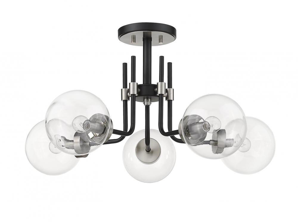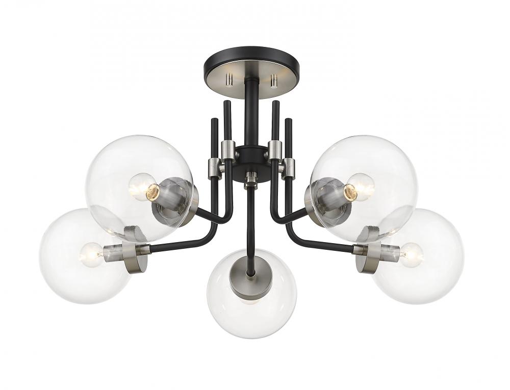 Give your home a spectacular new look with this clean, crisp five-light semi-flush mount light. It features a matte black and brushed nickel finish and clear glass shades that deliver the light you want. It will add a touch of brilliance to any space in the home, from bathroom and bedroom to dining room and kitchen to living room and game room.