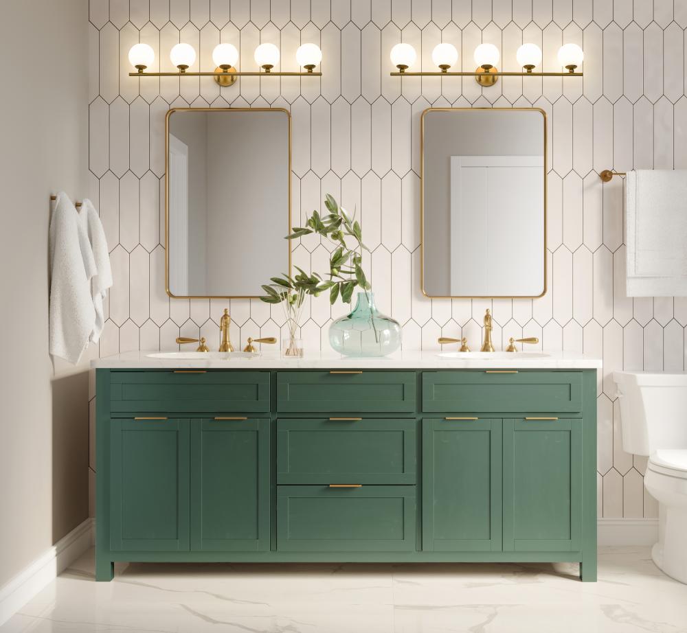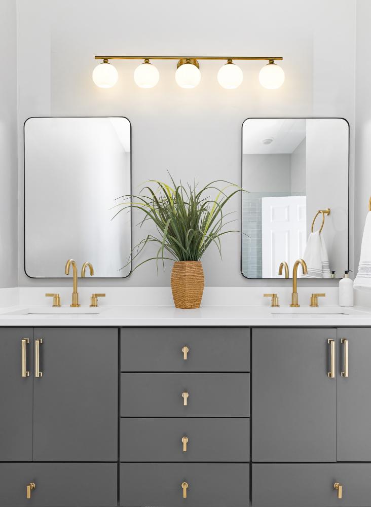Beautiful modern gold finish steel framing nestle opal etched glass orb shades, all designed to create this stylish five-light vanity light from the Neoma collection. An updated custom fixture, it becomes a focal point in a contemporary ensuite or guest bathroom with a devotion to festive personality. A bit of retro influence makes its way into a minimalist classic look with a wide reach aimed at highlighting larger bath vanities.