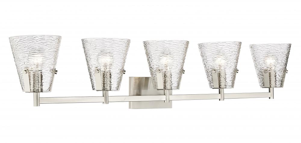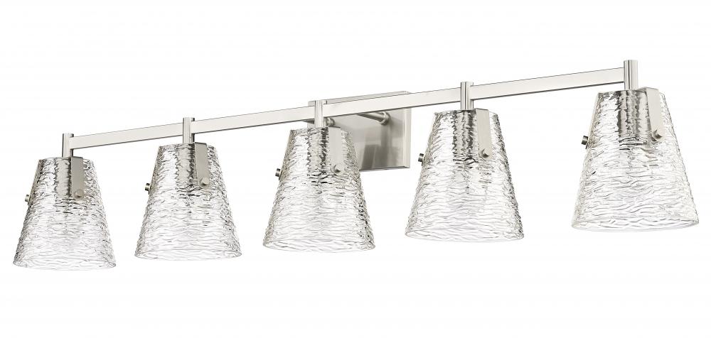 An ethereal blend of nautical and chic contemporary flavors forms a perfect way to highlight spacious modern bath vanities. From the Analia collection, this gorgeous five-light bath vanity light begins a design journey with decadent hand-blown textured clear glass shades in a conical shape. A linear brushed nickel finish steel frame offers a versatile element in a vanity light with both modern and transitional personalities.