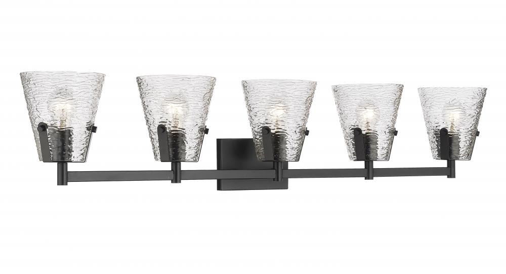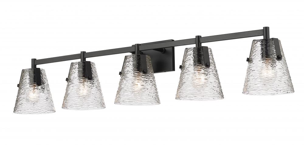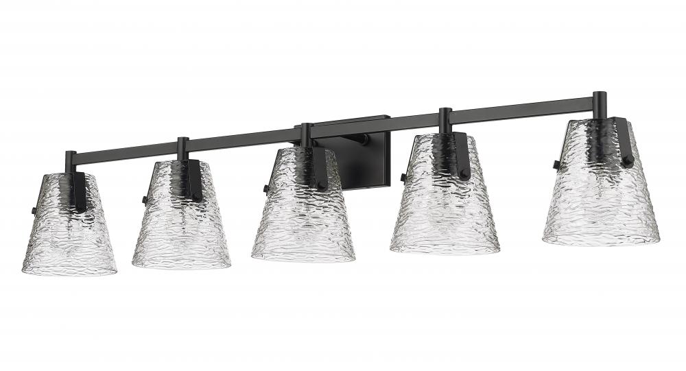 Aim for a contrast in palette and a stylish updated look in a bath fixture that illuminates a spacious vanity. From the Analia collection, this gorgeous five-light bath vanity light begins a design journey with decadent hand-blown textured clear glass shades in a conical shape. A linear matte black finish steel frame offers a versatile element in a vanity light with both modern and transitional personalities.