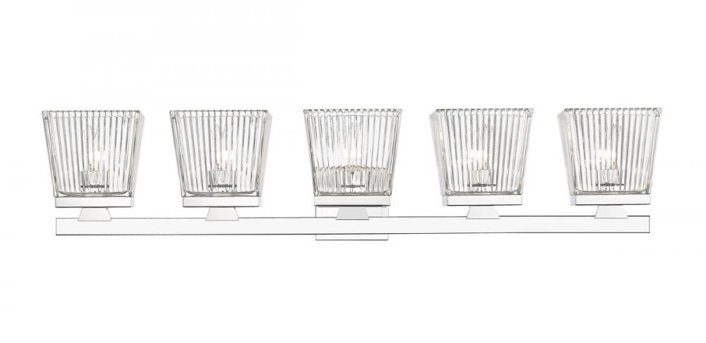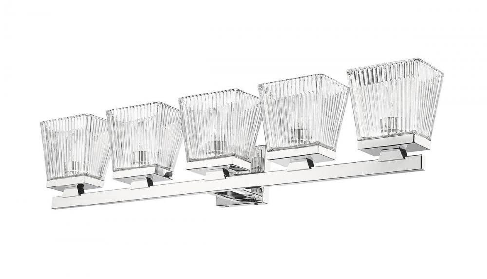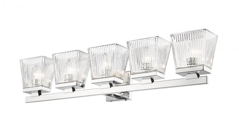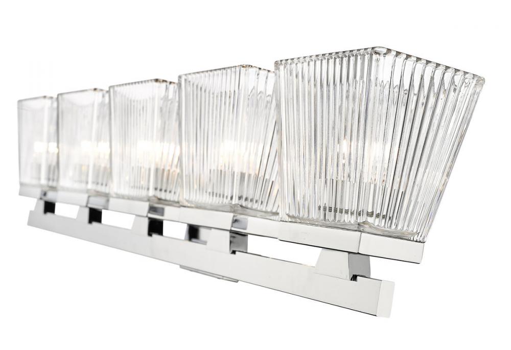 A five-light vanity light in chrome is a quick and easy way to include farmhouse-chic character to your bathroom. The clear glass shade is ribbed for additional aesthetic allure.