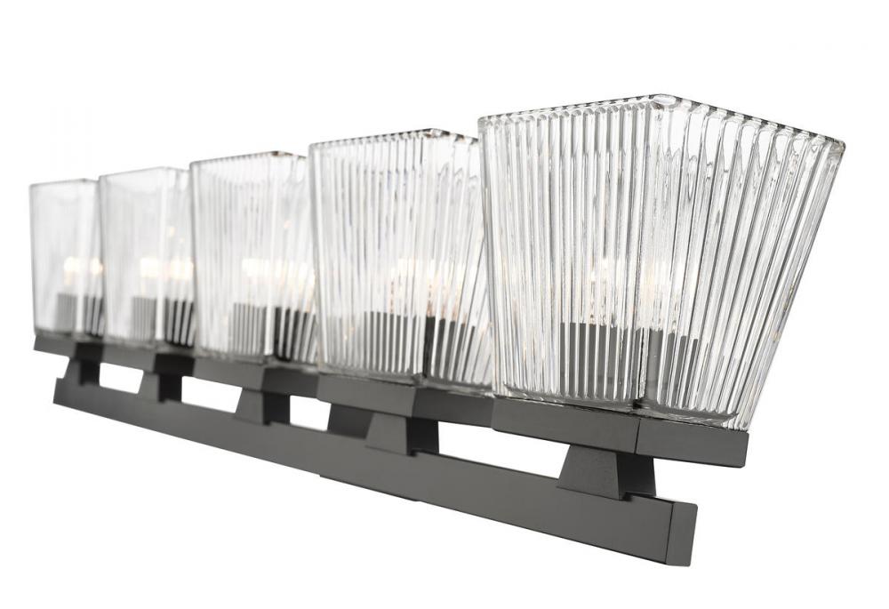 A five-light vanity light in matte black is a quick and easy way to include farmhouse-chic character to your bathroom. The clear glass shade is ribbed for additional aesthetic allure.