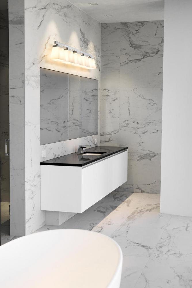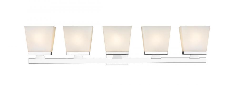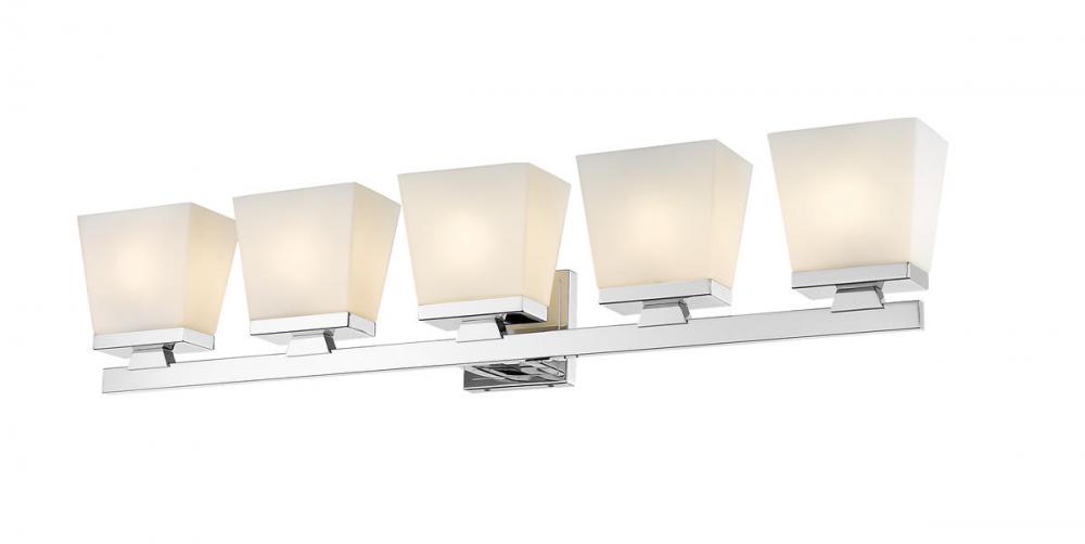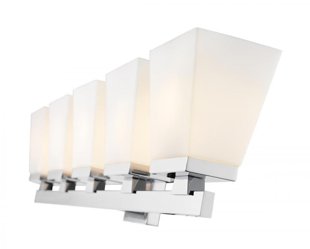 With its smooth steel construction and chrome finish, this modern farmhouse five-light vanity adds a shine to any bathroom or hallway. The glass shade in an etched opal finish adds an alluring essence to the fixture.