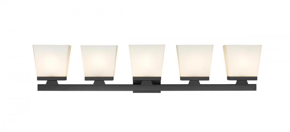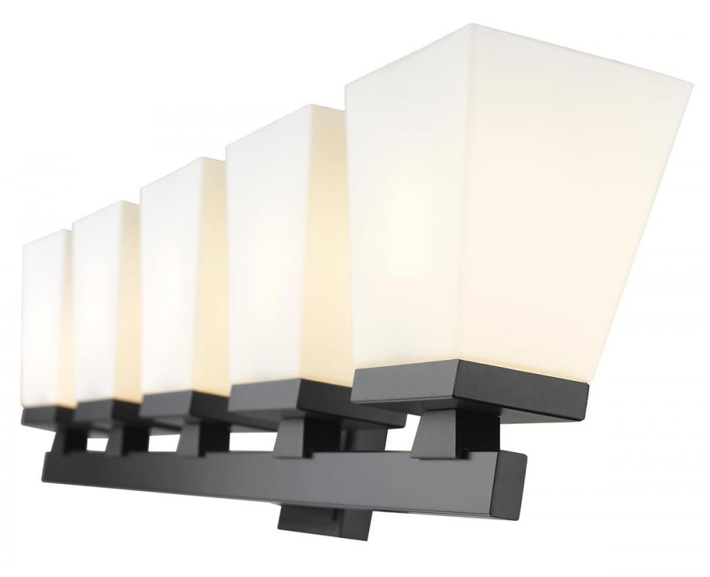 With its smooth steel construction and matte black finish, this modern farmhouse five-light vanity adds a shine to any bathroom or hallway. The glass shade in an etched opal finish adds an alluring essence to the fixture.