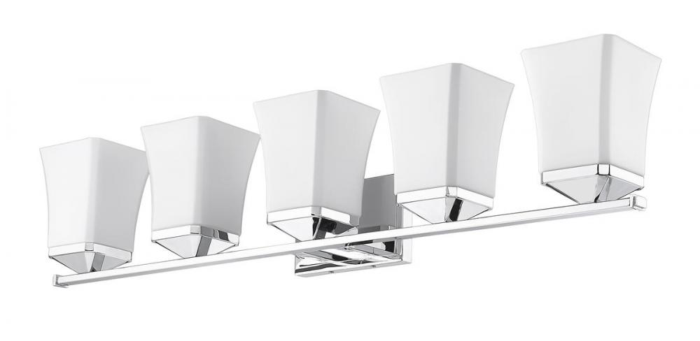 This simple yet stylish five-light vanity fixture is an easy upgrade to your bathroom. Featuring five glass shades in etched opal, a flared silhouette instantly catches the eye along with a chrome finish.