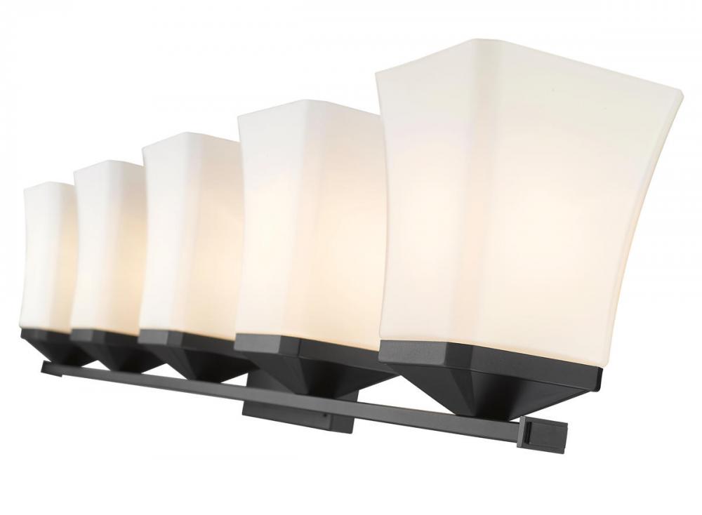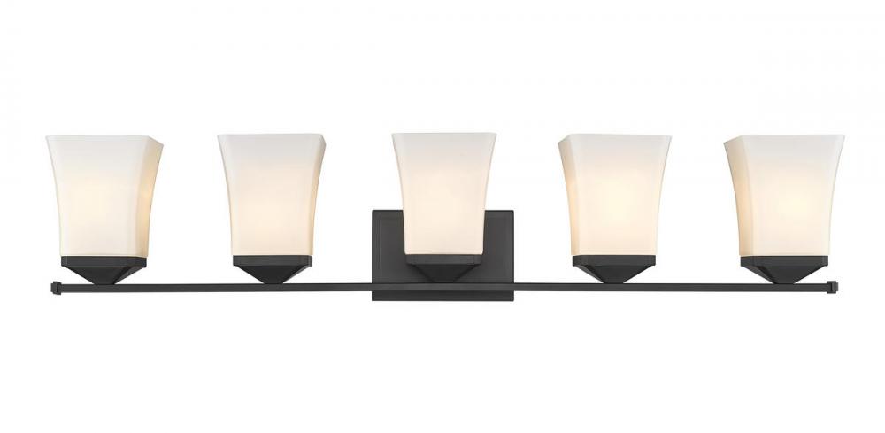 This simple yet stylish five-light vanity fixture is an easy upgrade to your bathroom. Featuring five glass shades in etched opal, a flared silhouette instantly catches the eye along with a matte black finish.