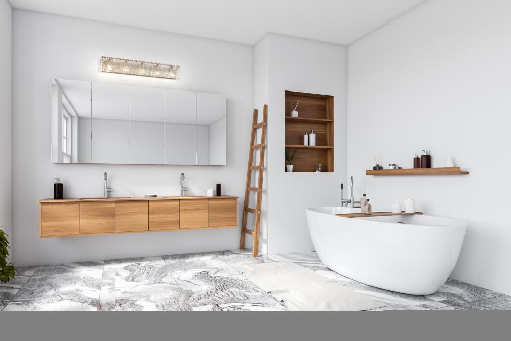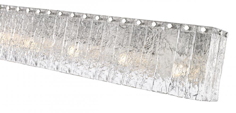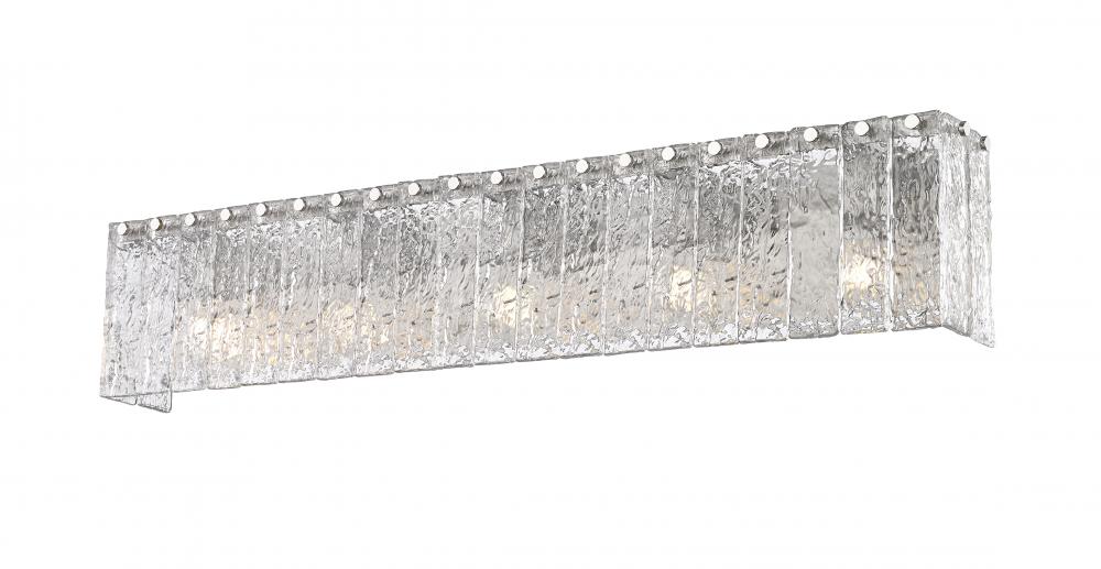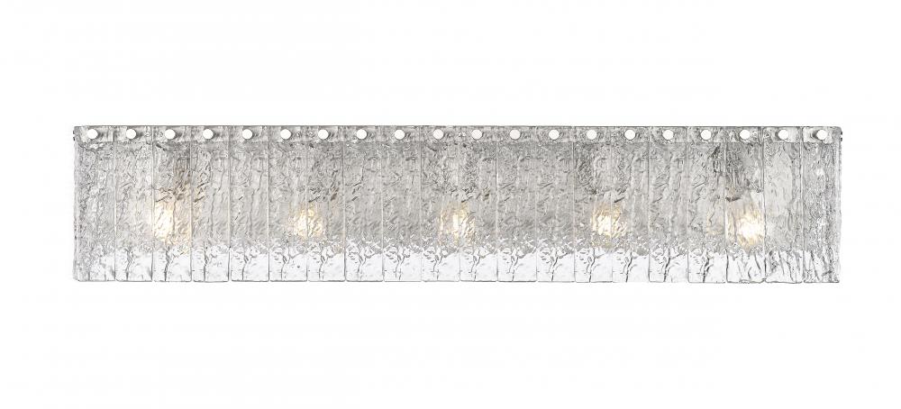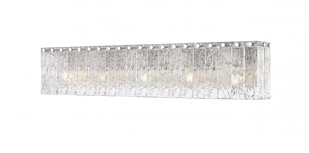 A sleek linear silhouette is enhanced with icy textured glass in this modern five-light vanity bath light. Its minimalist frame is built from durable steel and showcases a soft brushed nickel finish, adding gleaming flair in your primary or guest en suite. Vertical glass panels enhance its sense of structure and depth, creating bold dimensionality in your sophisticated home.