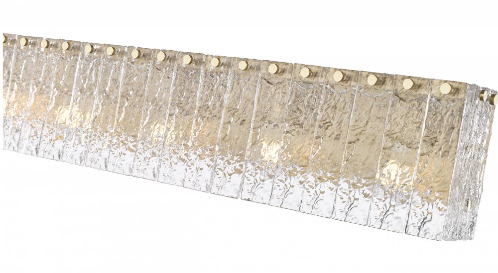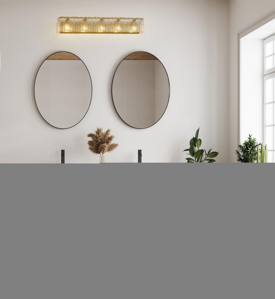 The radiant warmth of a modern gold finish pairs perfectly with the icy texture and depth of this modern five-light vanity bath light. Creating a refined focal point, its the perfect upgrade for a primary or guest ensuite. Clean lines define its silhouette, while durable steel framing ensures longevity.