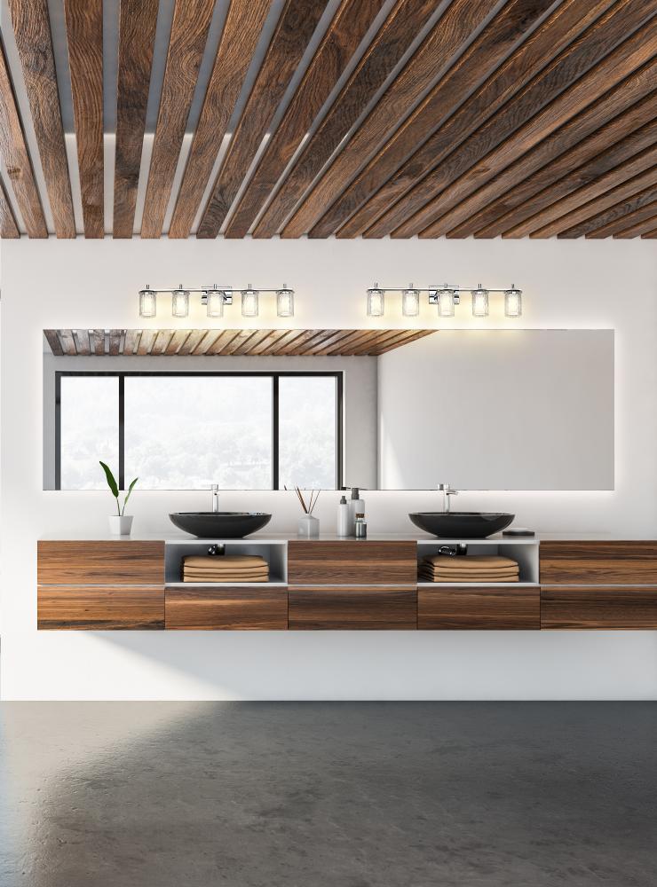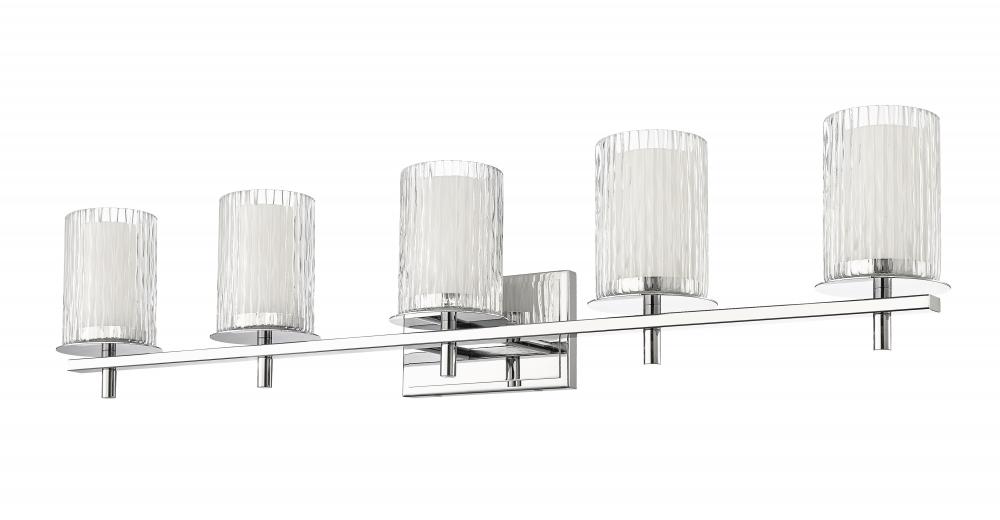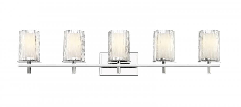 Spacious bathrooms benefit from the extra-wide build and stunning style motif of this modern five-light vanity light. Intricate detail is textural and artisan with clear glasswork in a cylinder shape, with an inner white diffuser. Etched opal and clear glass blend as they enhance brilliant chrome finish framing and show off a crisp mix of circles and lines.