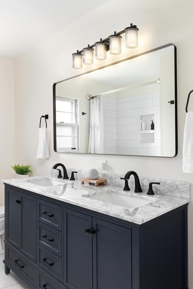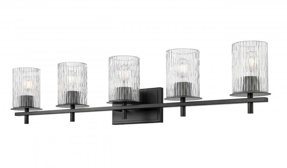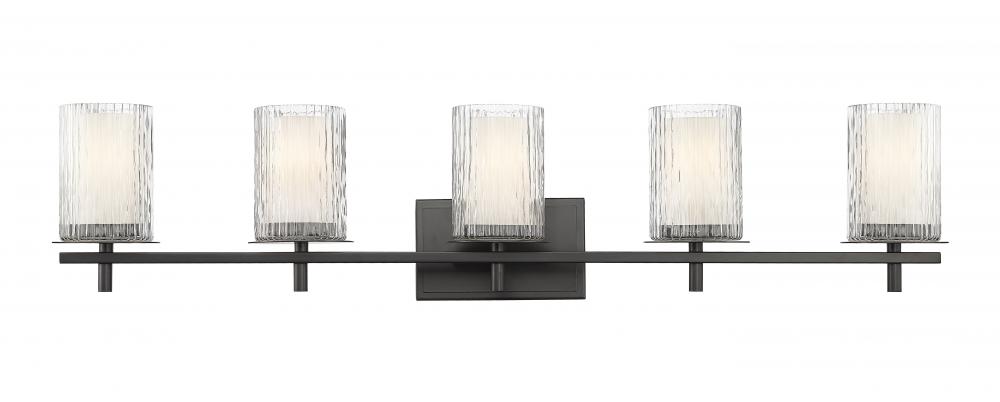 A slick contrast stands out to be noticed as this modern five-light vanity light updates bathrooms with iconic design elements. Intricate detail is textural and artisan with clear glasswork in a cylinder shape, with an inner white diffuser. Etched opal and clear glass blend as they enhance bold matte black finish framing and show off a crisp mix of circles and lines.