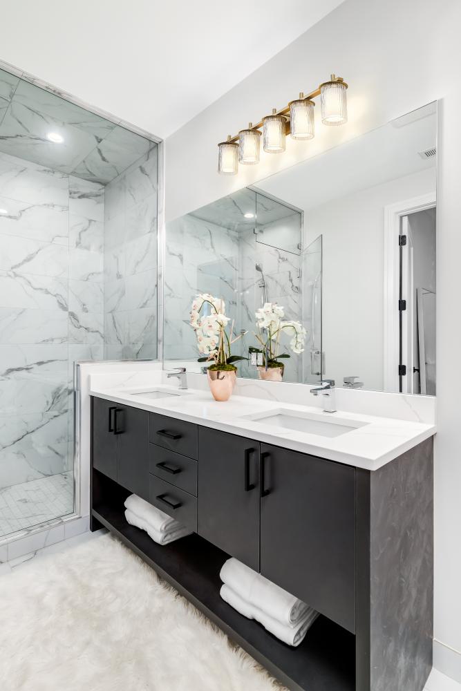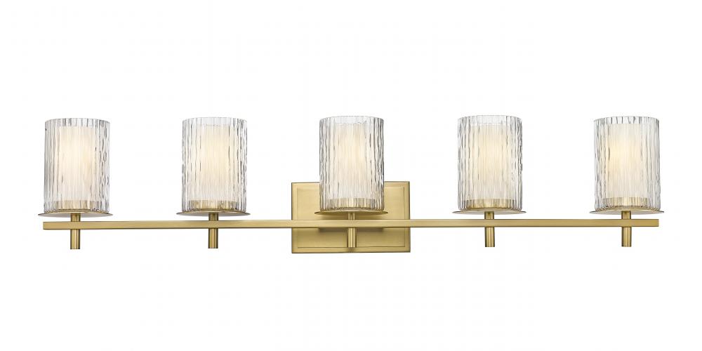 Unforgettable glam style offers an exquisite look in any bath space as this five-light vanity light updates modern bathrooms. Intricate detail is textural and artisan with clear glasswork in a cylinder shape, with an inner white diffuser. Etched opal and clear glass blend as they enhance glam modern gold finish framing and show off a crisp mix of circles and lines.