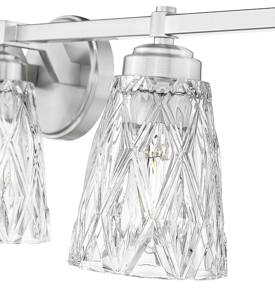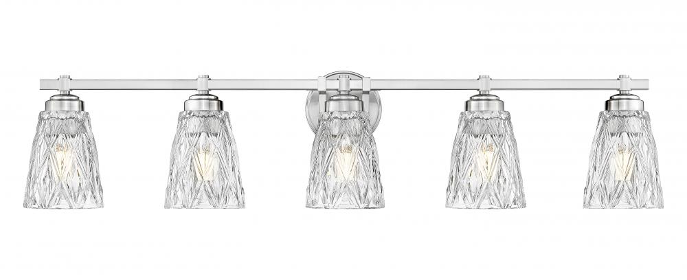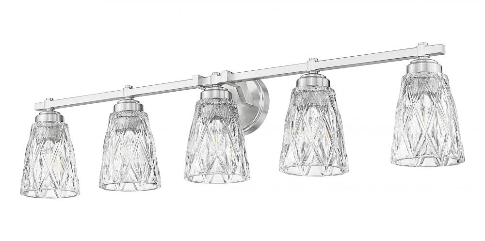 Enjoy a wide reach of ambient illumination in master or guest bath spaces with a five-light vanity fixture showcasing glam inspiration. A linear frame and accents made of brushed nickel metal offer versatility and a timeless design to a dimmable fixture sending illumination through thick clear glass conical shades with striking textural overlapping diamond patterning. Make this light part of a refreshed design in bathrooms and dressing spaces.