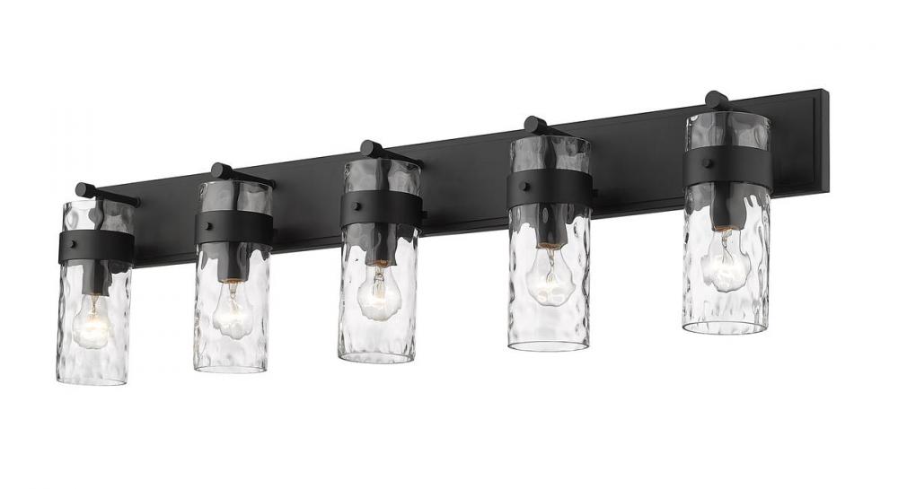 This five-light vanity fixture in matte black will add a warm and inviting glow to bathrooms and hallways. It is made of steel with a glass shade that boasts a ripple texture that catches the eye.