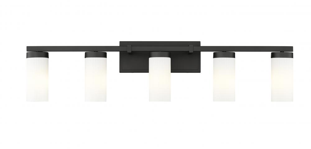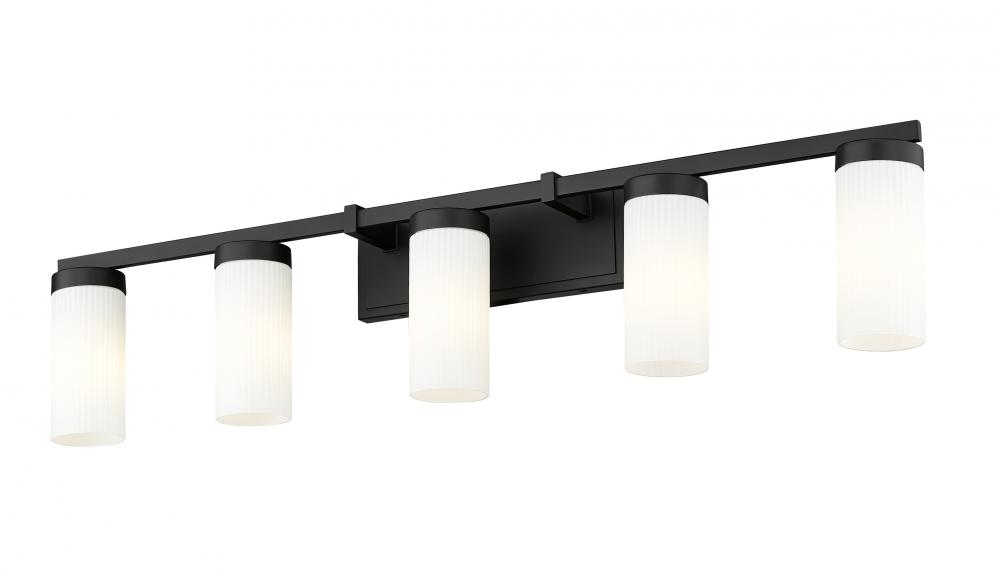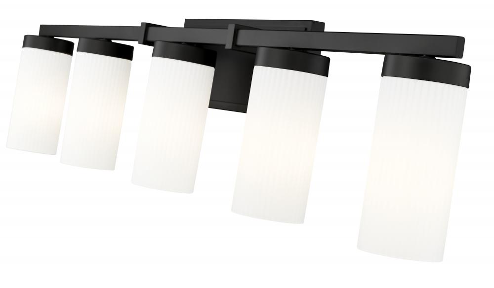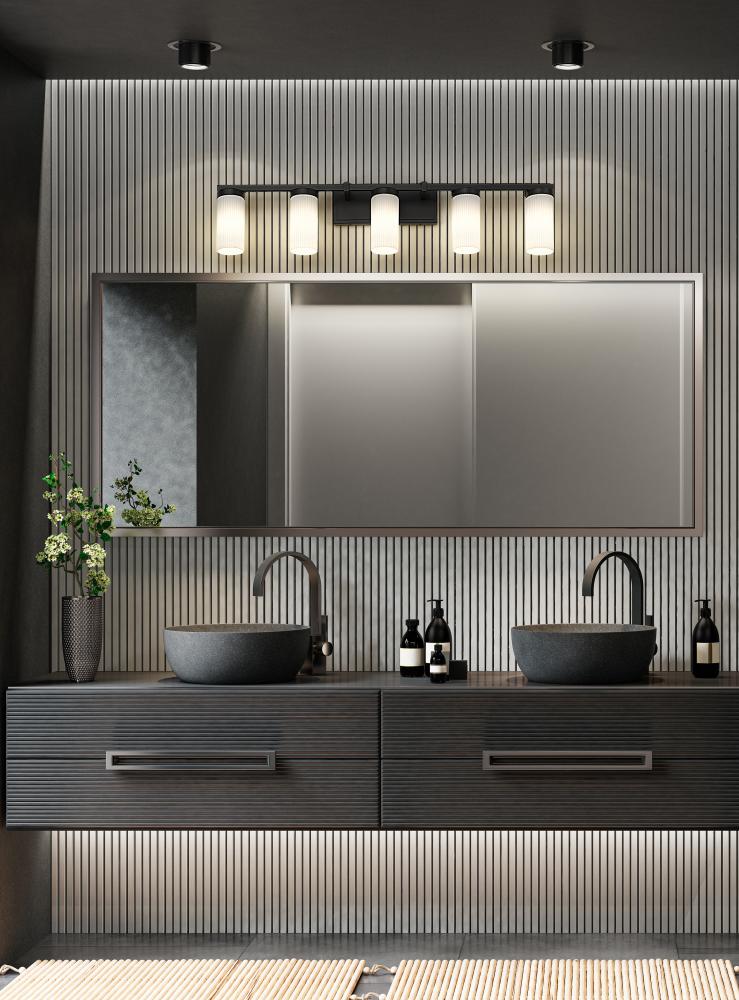 A modern five-light vanity fixture creates bright, inviting illumination with cylinders of white glass diffusing each light. A matte black frame finish emphasizes its clean, crisp silhouette, perfect for accentuating a sleek, contemporary en suite or guest bath.