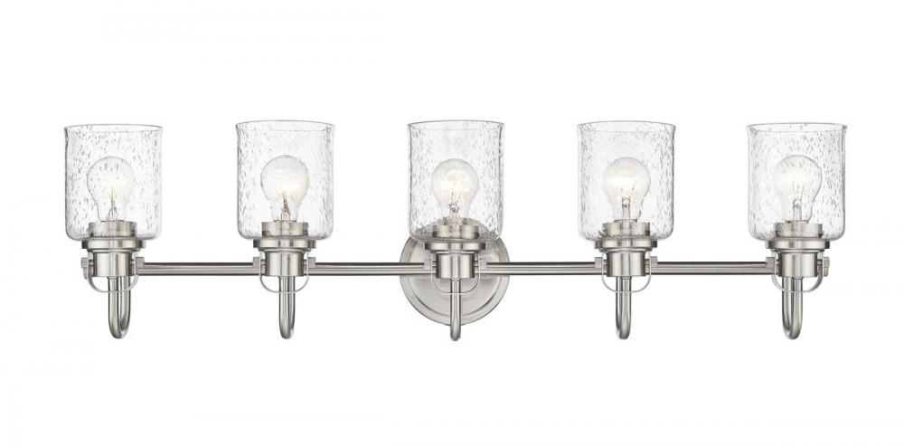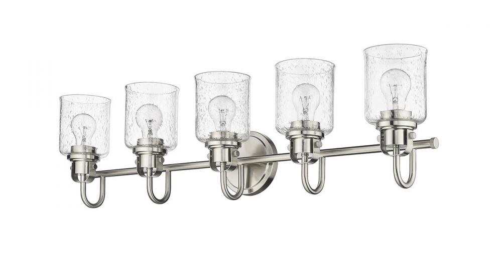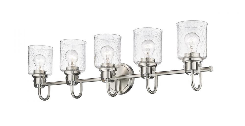 Give your hallway, bathroom or bedroom a metropolitan vibe with a five-light vanity fixture in brushed nickel. The seeded glass shade provides soft light for your space.