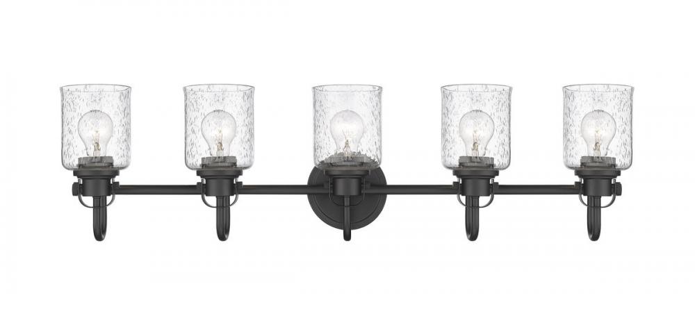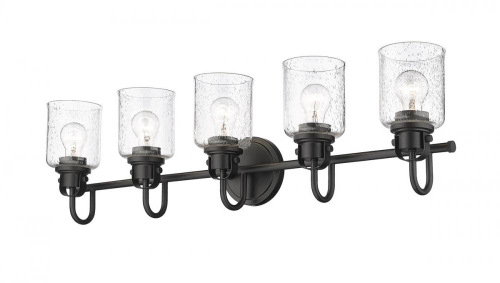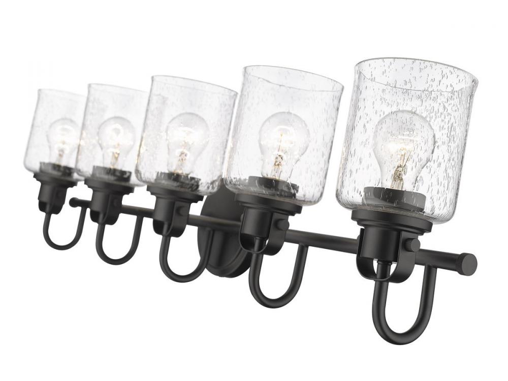 Give your hallway, bathroom or bedroom a metropolitan vibe with a five-light vanity fixture in matte black. The seeded glass shade provides soft light for your space.