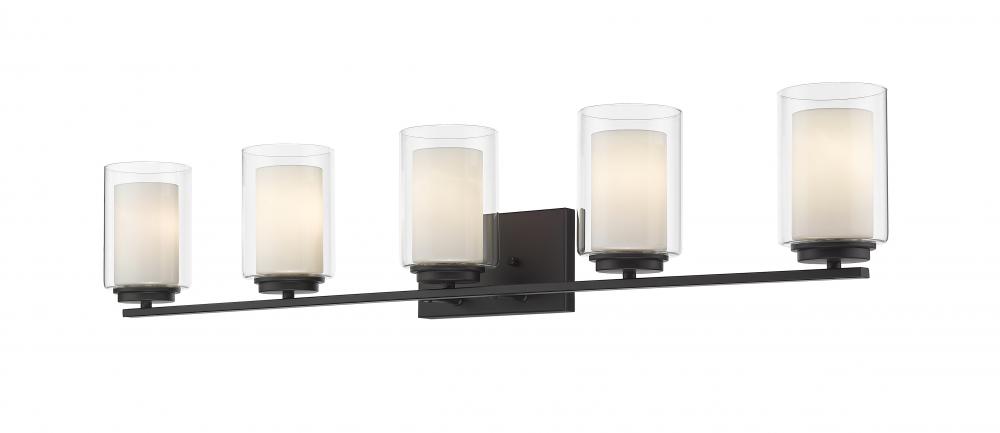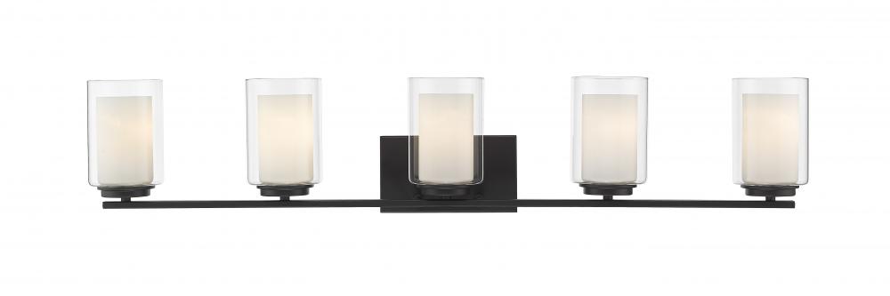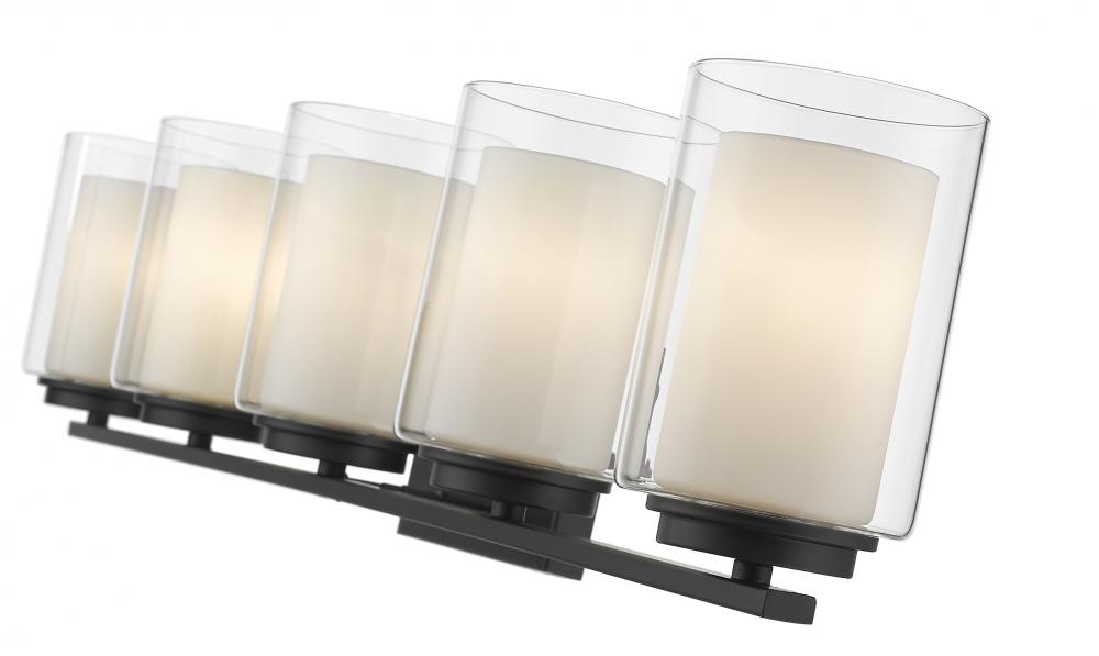 Give your powder room a chic, sophisticated update. This beautiful, matte black vanity light features five glowing bulbs beneath five delicate, glass shades that are matte opal on the inside and clear on the outside. An exquisite lighting option to highlight your refined sense of style.