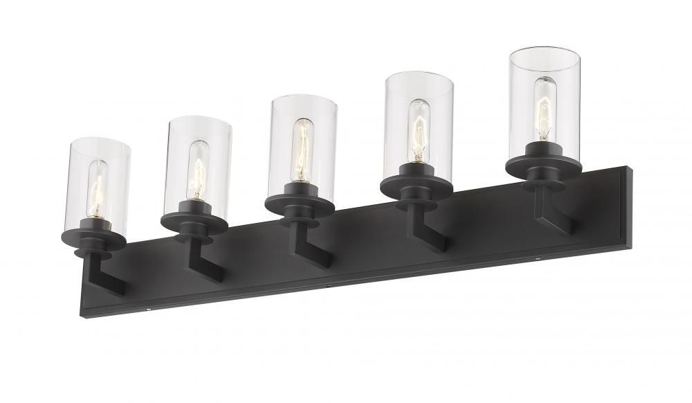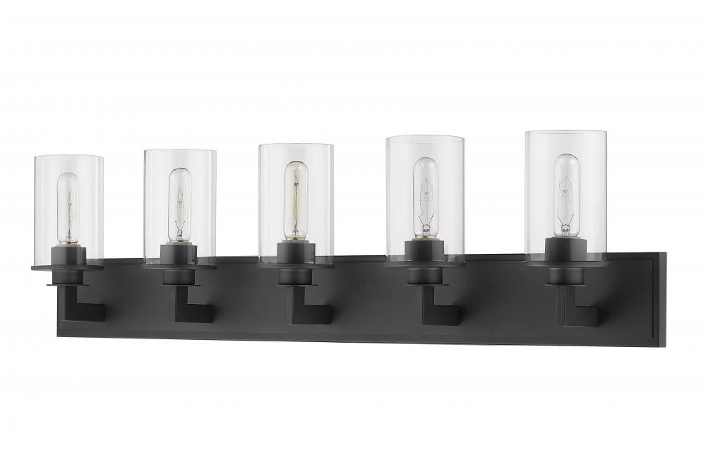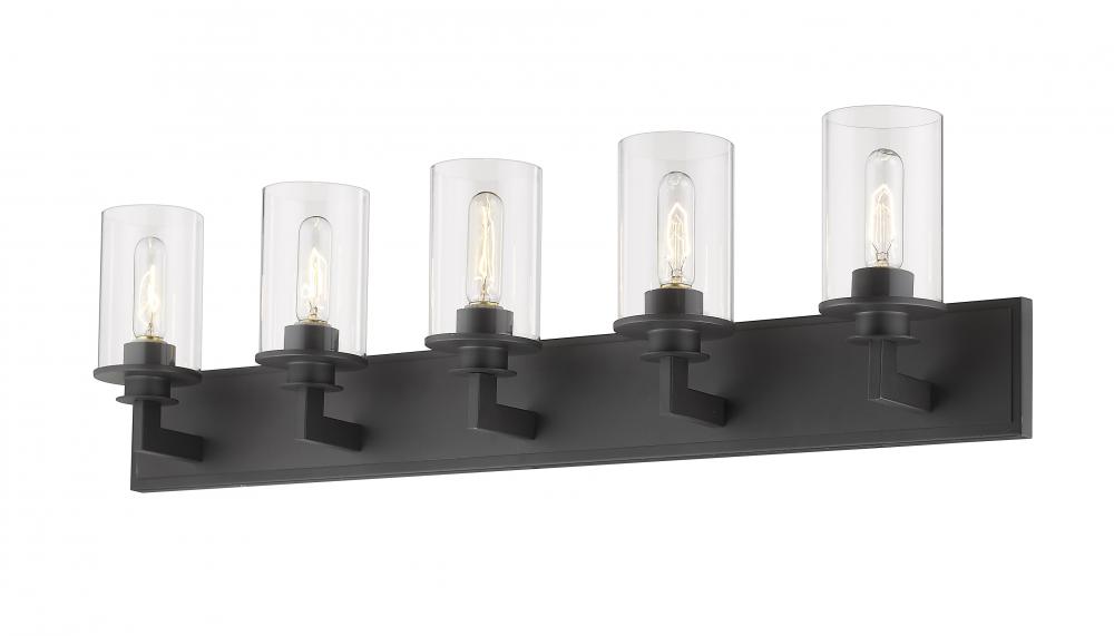 Cozily inviting with a depth of warmth, this mid-century modern five-light vanity sleekly breaks the contemporary mold. A rustic bronze finish feels timeless while the glowing brilliance of the clear glass cylinder shades is radiant.
