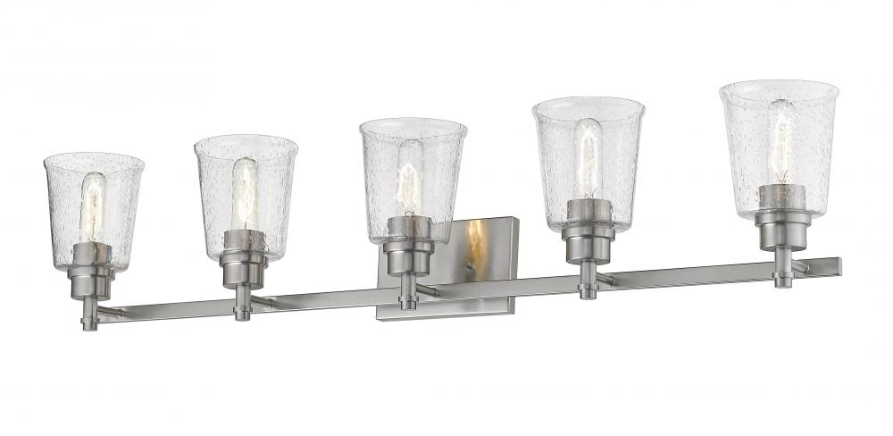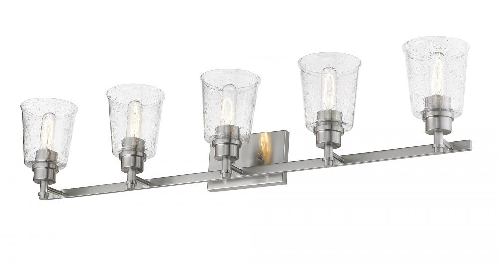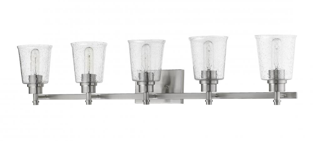 A master en suite gains exceptional elegance with this brushed nickel five-light vanity light. Enjoy the artistic and architectural design of a stunning fixture with clear seedy glass shades, offering a perfect fit to both contemporary and transitional decor schemes.