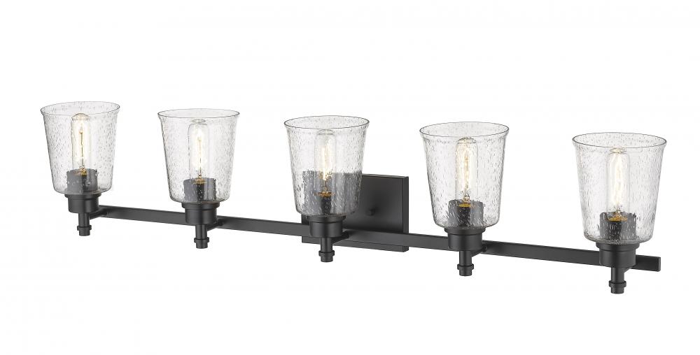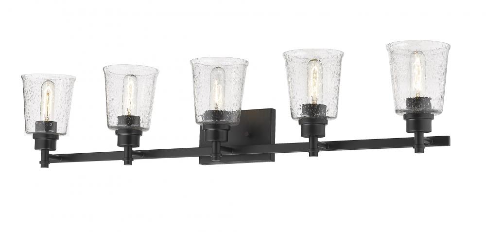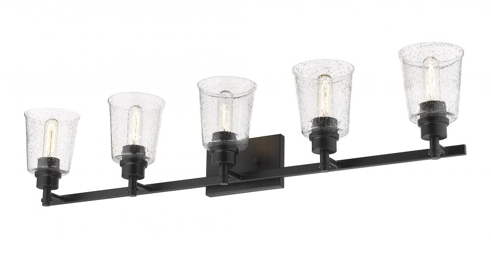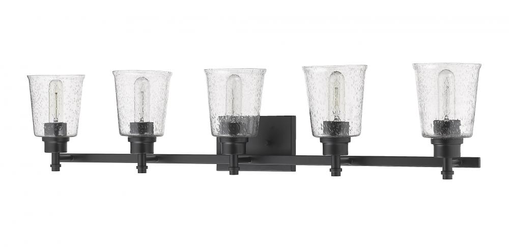 Personality and verve create an eye-pleasing aesthetic in this matte black finish five-light vanity light. Build a compelling vision in a contemporary or transitional bath space with a rugged steel frame that houses softly delicate shades made from clear seedy glass.