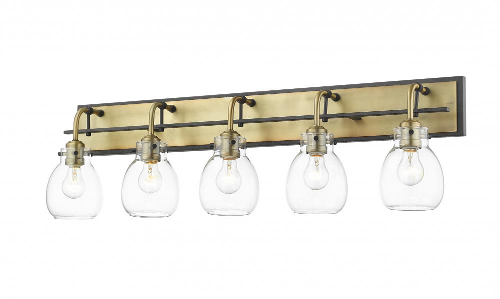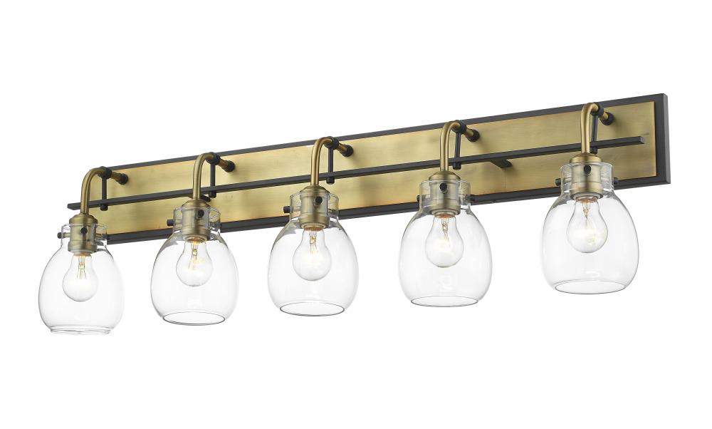 Dramatic elegance proves captivating in a transitional master or guest bath suite. This five-light bath light blends olde brass and matte black in a rectangular frame hosting five delicate clear glass shades.
