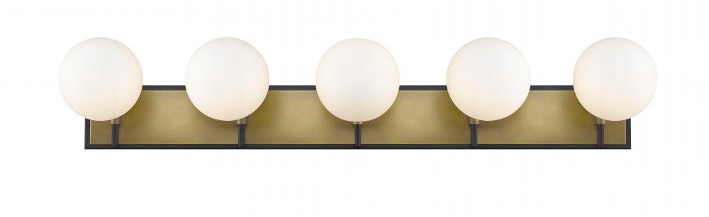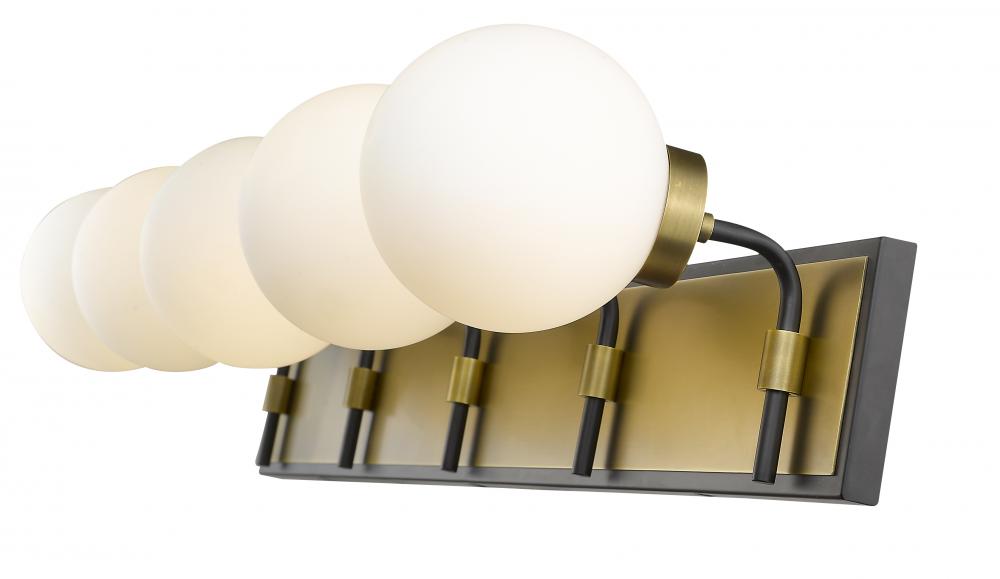 Reinvent the look and feel of your home with this gorgeous five-light vanity. Its crafted with a matte black and olde brass finish and opal shades for a soft warm radiance. Its mix of modern panache and old school lines will be a perfect fit for a master bathroom or powder room.