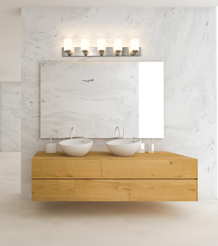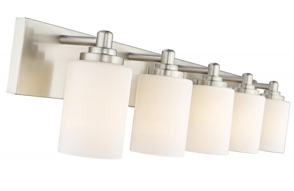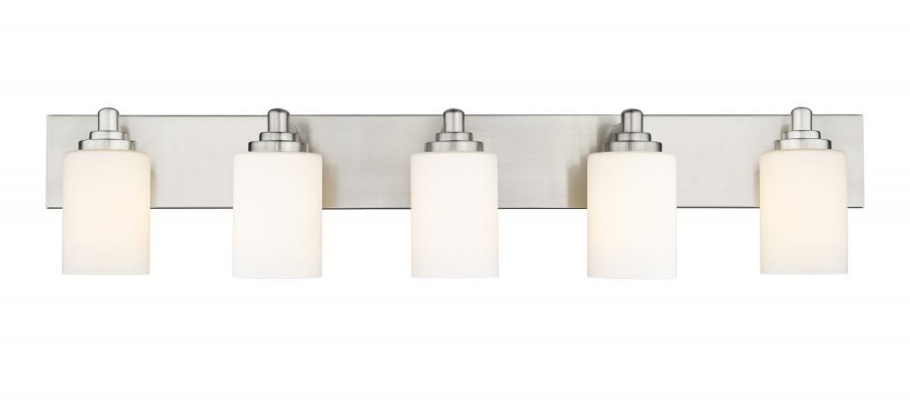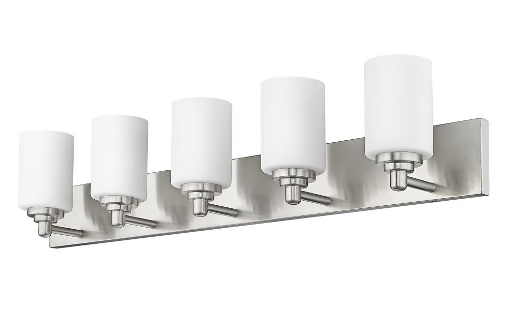 Highlight the classic minimalist look of a five-light vanity light embellished with tastefully subtle accents. From the Soledad collection, this fixture features a straightforward silhouette with brushed nickel finish steel serving as a rectangular wall plate and holder, and five side-by-side chic cylinder shades made of delicate white opal glass. This vanity light may be mounted facing up or down in an en suite or guest bath space.
