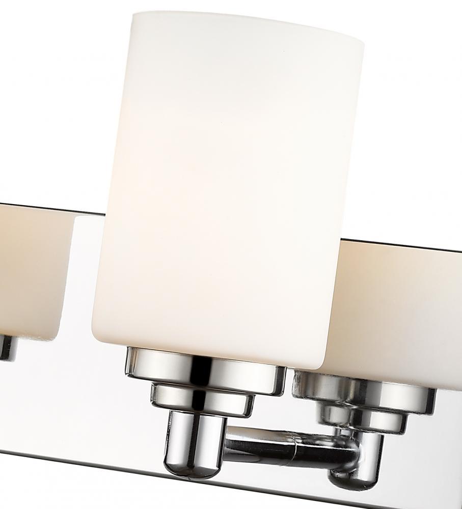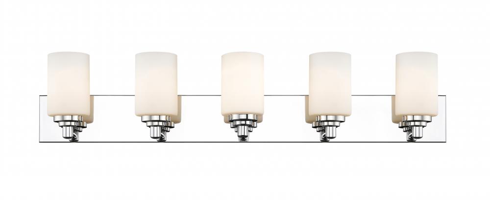 Let your bathroom or hallway bask in soft, warm light. This contemporary five-light wall sconce has a sophisticated, streamlined look, and extends from a long mirrored plate for extra gleam. From the sconces cylindrical white etched glass shades to its chrome finish, this fixture stylishly upgrades your space.