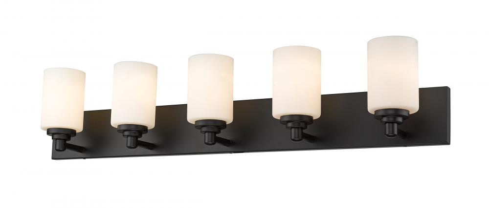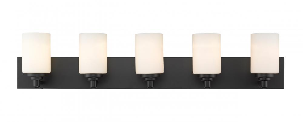 Let your bathroom or hallway bask in soft, warm light. This contemporary five-light wall sconce has a sophisticated, streamlined look, and extends from a long mirrored plate for a chic contrast. From the sconces cylindrical white etched glass shades to its matte black finish, this fixture stylishly upgrades your space.