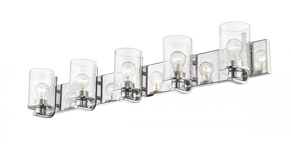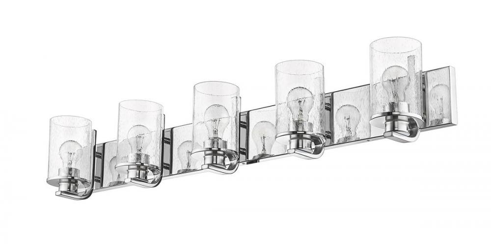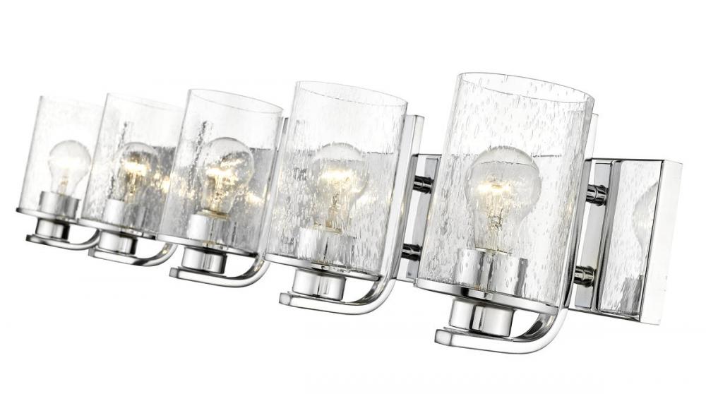 A modern version of nautical charm makes its way into this five-light vanity light from the Beckett collection, adding a pleasing touch to any space. Larger bath areas light up with this vanity light fashioned of bright chrome finish steel with a rectangular wall mount and charming accents. Clear seedy glass shades in cylindrical form offer a delicate, natural infusion of romance.
