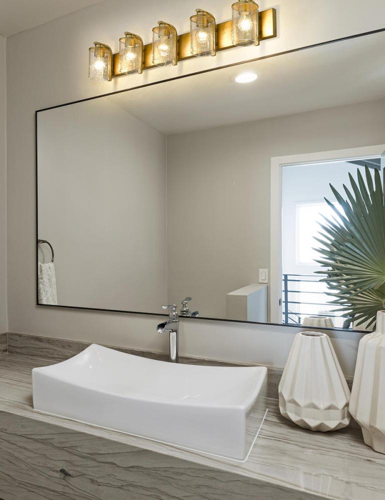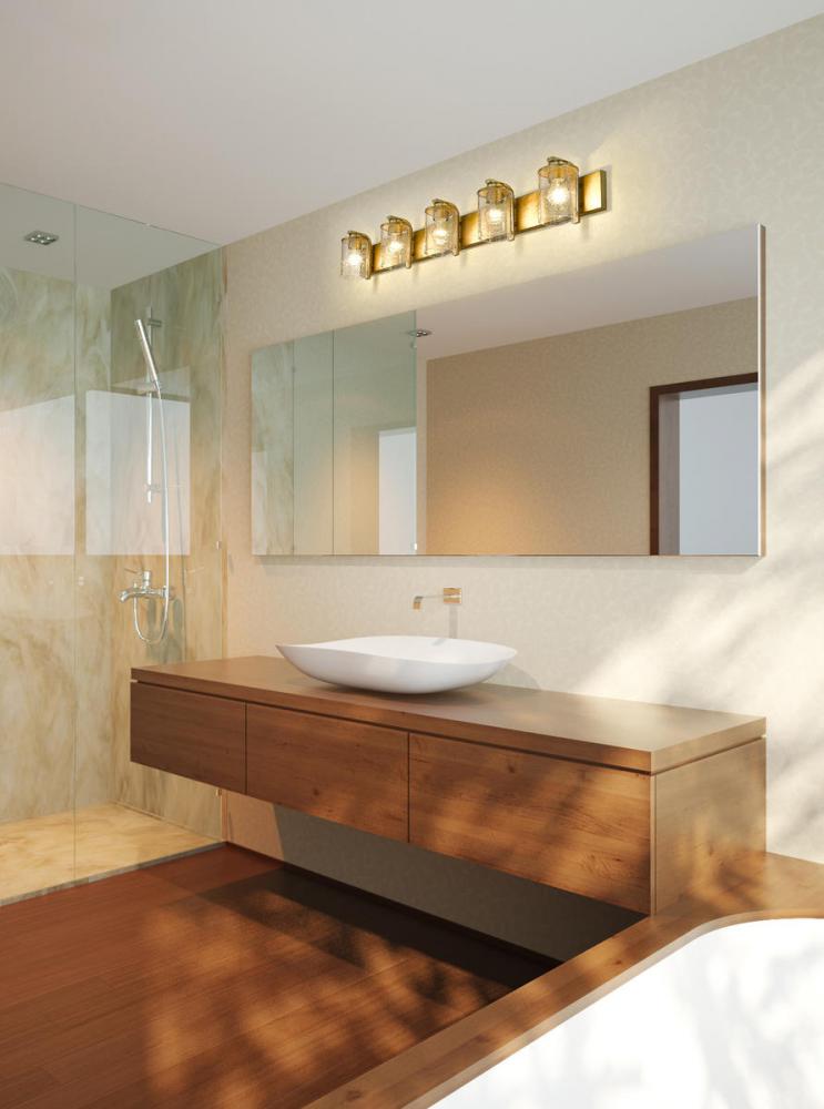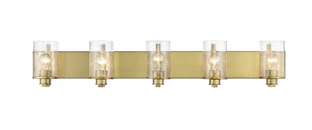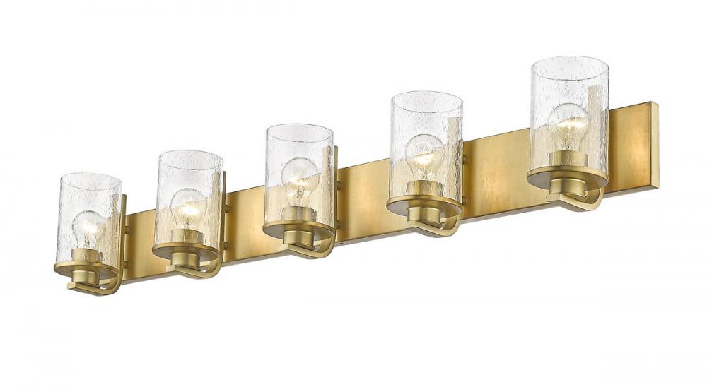 A modern version of nautical charm makes its way into this five-light vanity light from the Beckett collection, adding a pleasing touch to any space. Larger bath areas light up with this vanity light fashioned of olde brass finish steel with a rectangular wall mount and charming accents. Clear seedy glass shades in cylindrical form offer a delicate, natural infusion of romance.