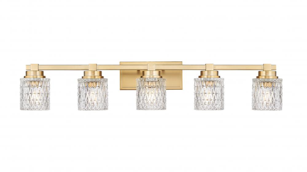 In the vein of the finest cut crystal glassware, the cylinder shades of this five-light vanity light deliver a sophisticated look with glam vibes, ideal for upscale master and guest bath spaces. Highlight a vanity with a fixture framed in modern gold steel with tastefully subtle accents, and appreciate the aesthetic and functional benefits of dimmable lighting.