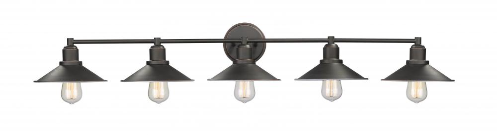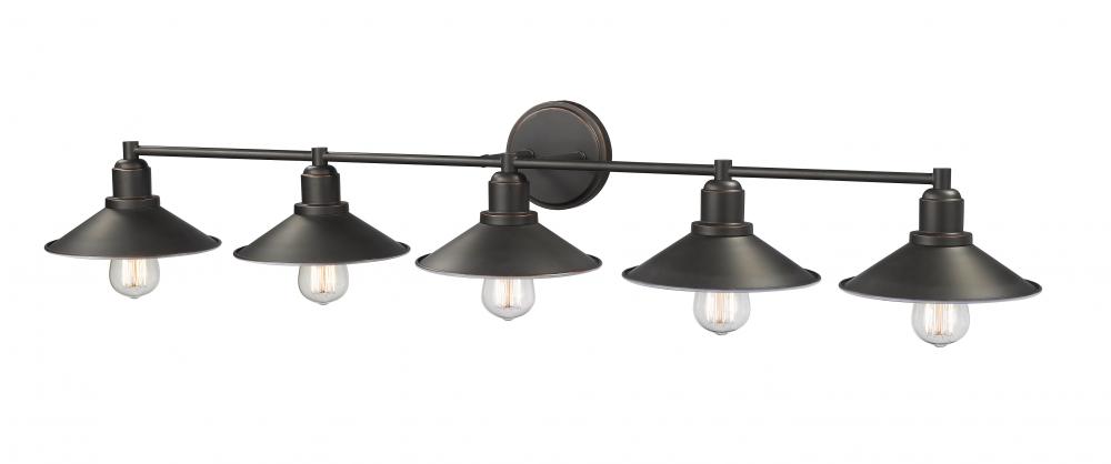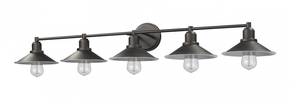 Design a stylish master en suite around the dynamic silhouette of this five-light vanity fixture. Luscious olde bronze finish steel creates a balanced mount and frame with hood shades and charming vintage bulbs.