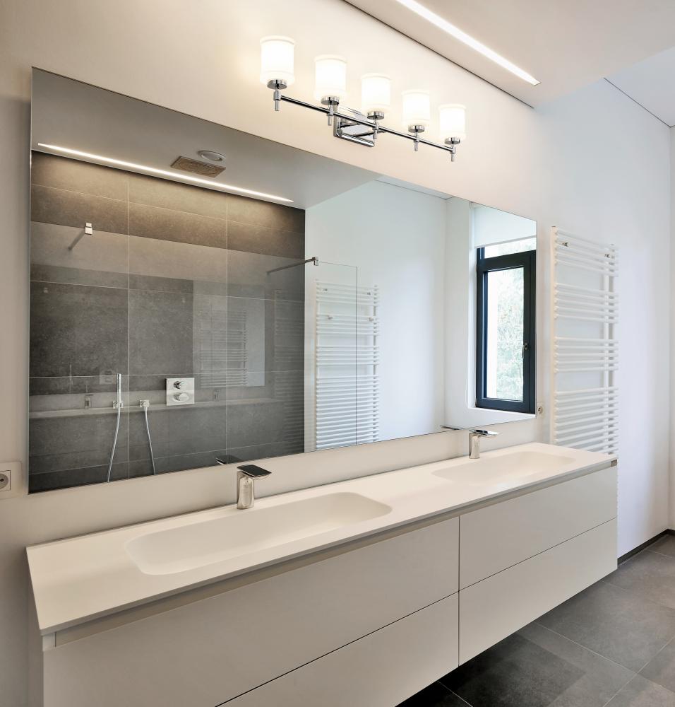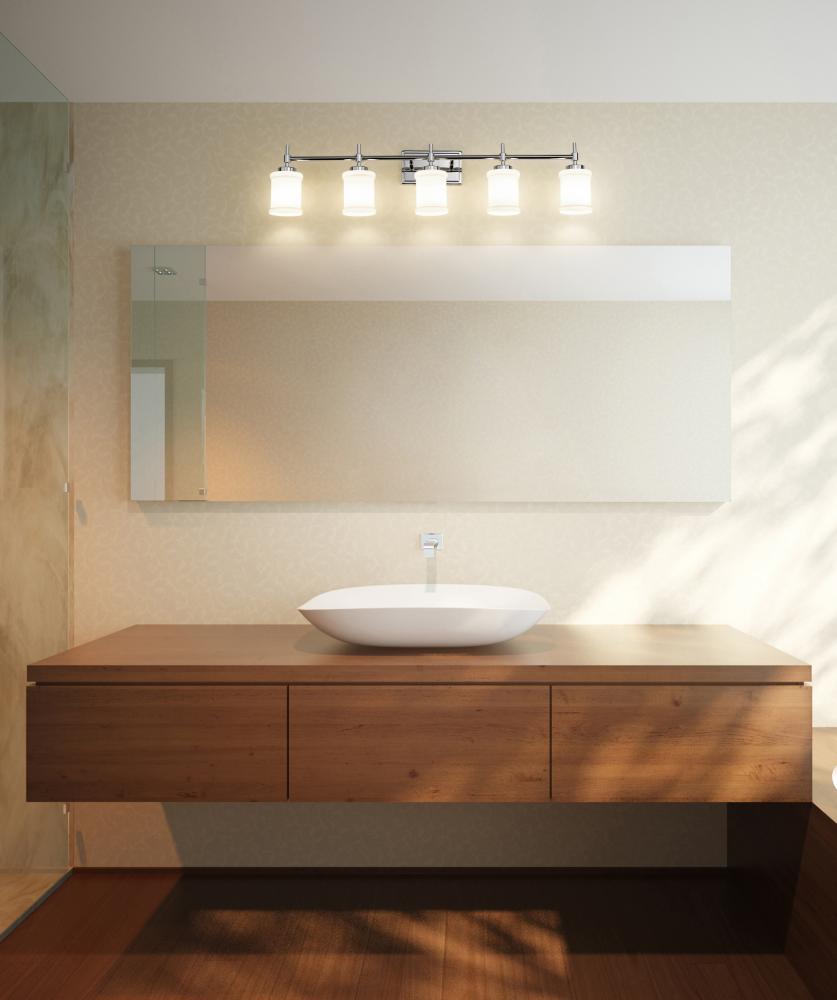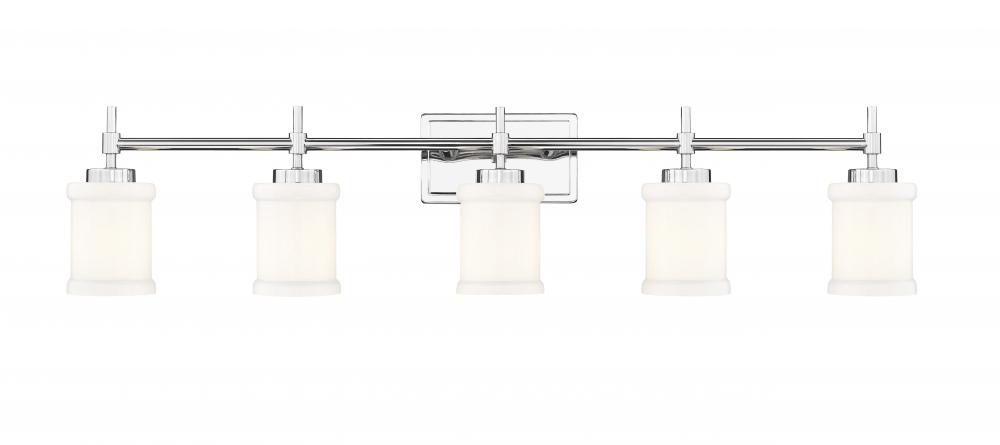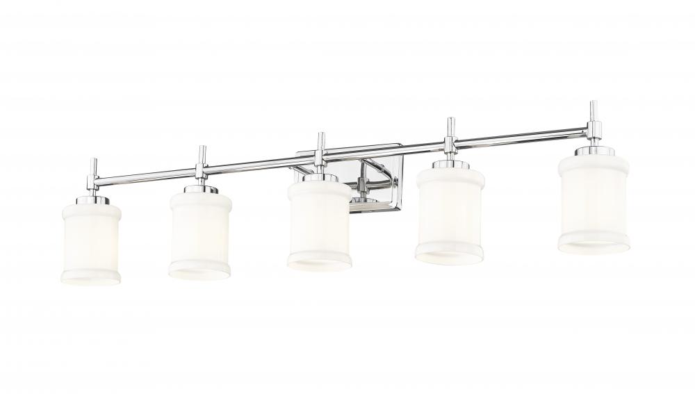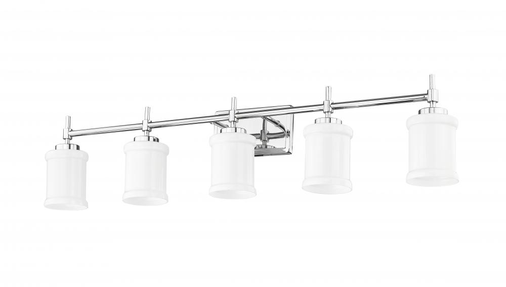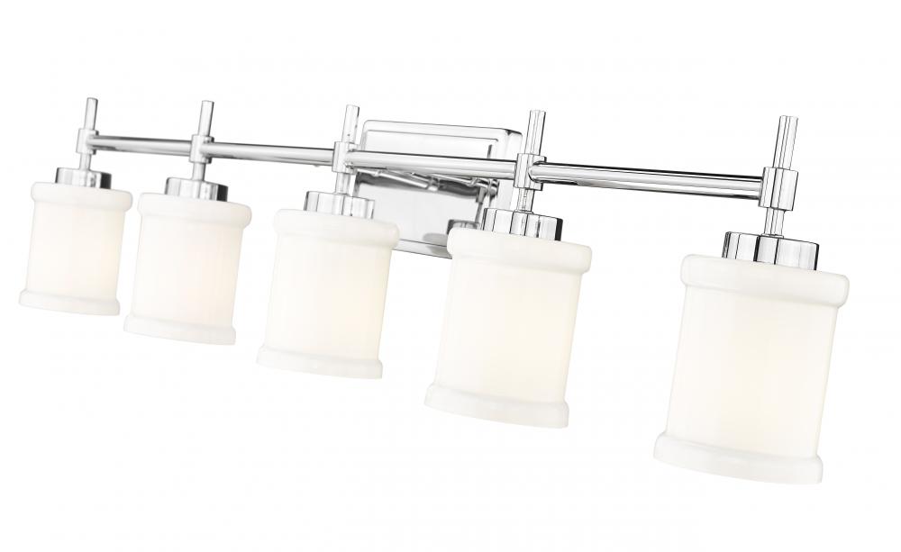 Strike a clean, contemporary note over your counter with this modern five-light vanity fixture. Perfect for a master bath, its designed with impeccable texture and depth, all highlighted with a gleaming chrome finish. Five cylindrical shades are crafted in glossy white glass, complete with cuff embellishments that add rich dimensionality.