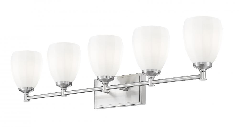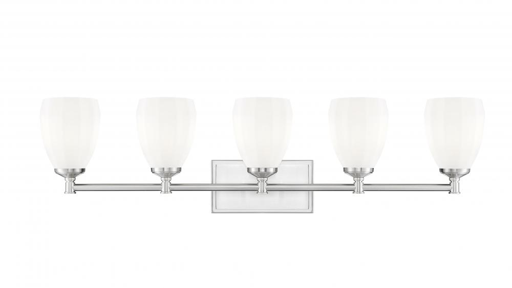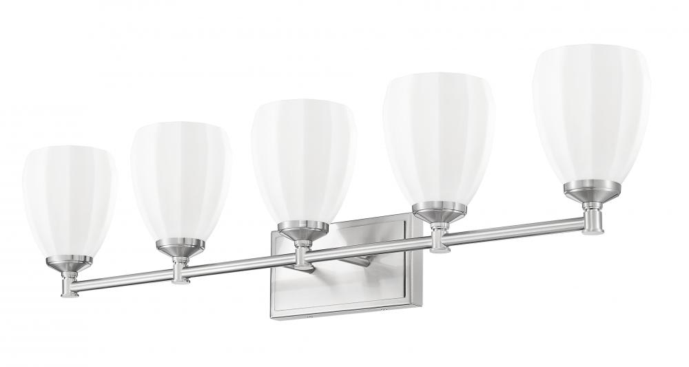 Classic meets contemporary in a modern five-light vanity wall light thats perfect for a refined bath. A brushed nickel finish sets the tone, while unique opal glass shades cast bright, diffused illumination thats perfect for all your daily tasks and rituals. A clean-lined silhouette is crafted in steel for excellent durability and style.
