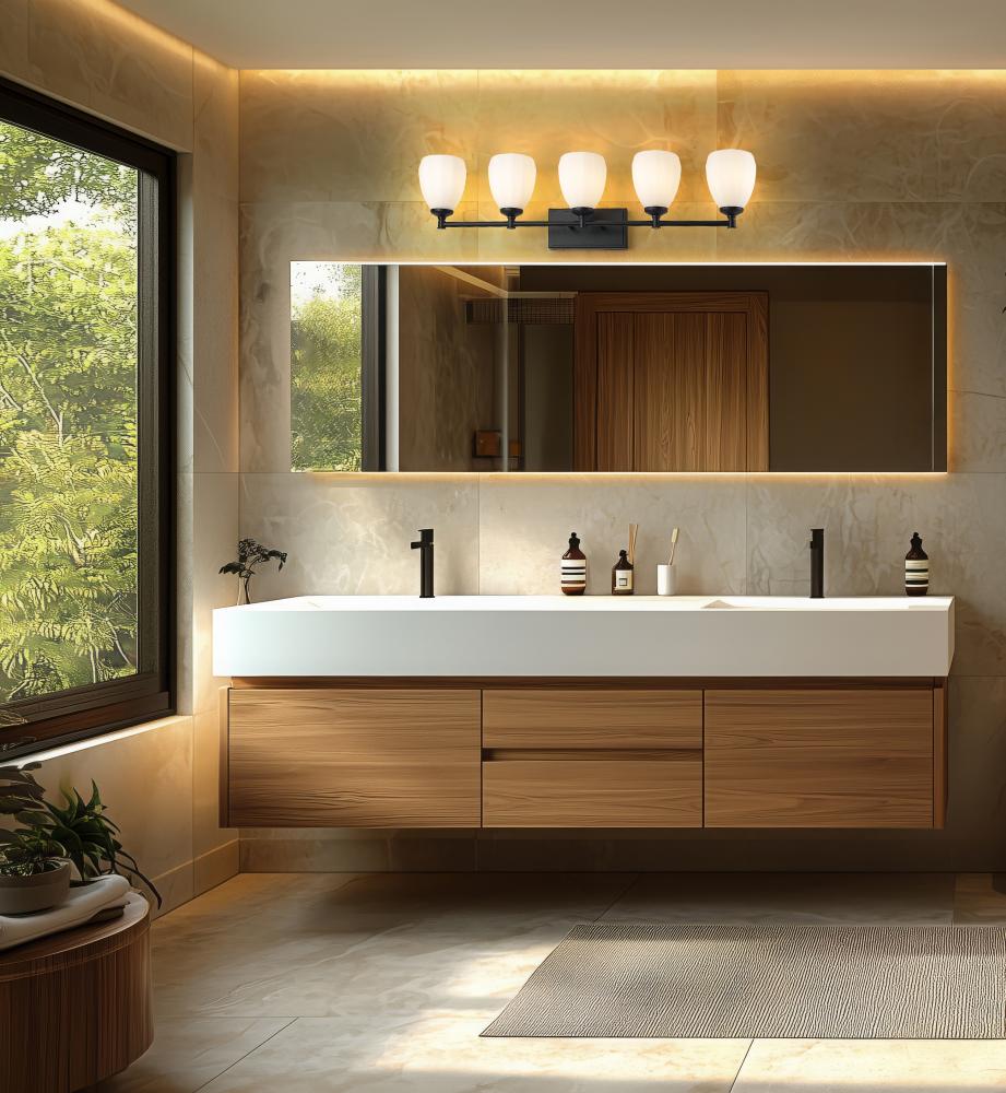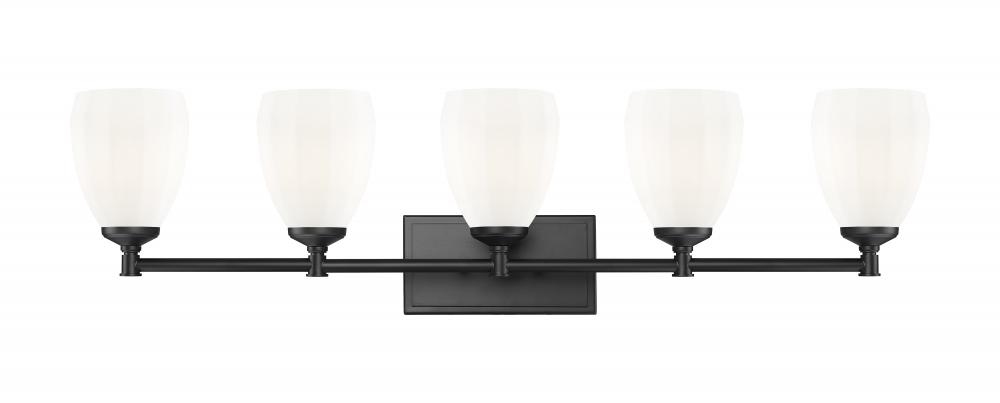 Upgrade your bath with the classical design underpinning this stylish five-light vanity wall light. It echoes a modern minimalist sentiment with a clean-lined silhouette and rich matte black finish, which ensures depth and contrast. Five shades are tall, tapering opal glass, creating softly diffused illumination for all your daily rituals.